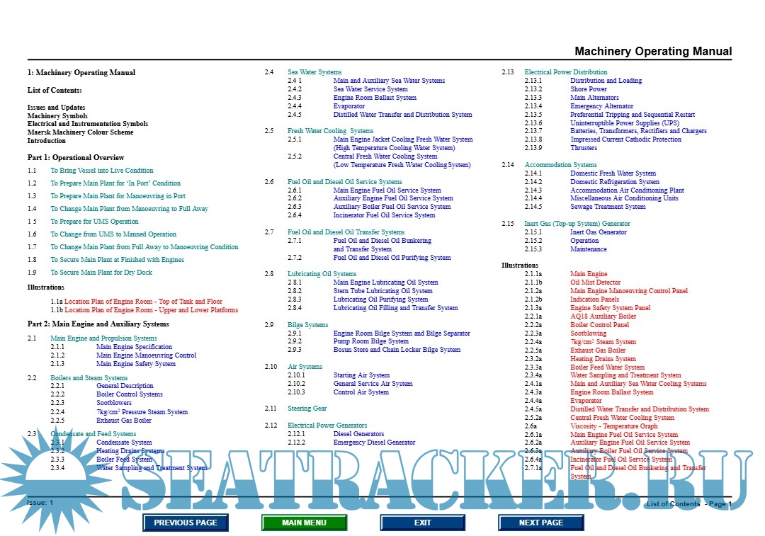 Year: 1995 Language: English Author: Maersk Genre: Operating Manual Publisher: Maersk Technical Operations Office Format: PDF Quality: eBook Pages count: 199 Description: The "Machinery Operating Manual" provides comprehensive guidance for technically proficient ship officers unfamiliar with the vessel, ensuring a clear understanding of its systems and equipment. This manual is intended to supplement existing shipbuilder plans and instruction books without replacing them. It is structured into multiple sections, covering machinery commissioning procedures, operational systems, control systems, emergency firefighting, and internal communication systems. Emphasis is placed on safety protocols, emergency procedures, and compliance with MARPOL 73/78 regulations. Detailed illustrations, system schematics, and standardized symbols are included to enhance comprehension and operational