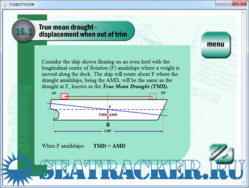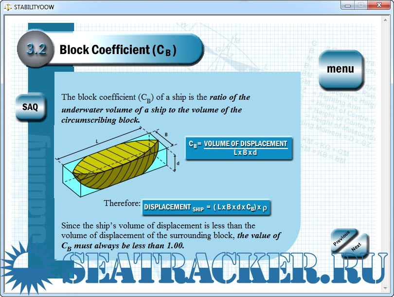 The purpose of including the more advanced material is primarily one of giving the program a suitable ending. To only cover those topics necessary to pass the OOW level examinations would be like writing a book but missing out the last chapter! Sections 16-19 take the learner beyond the scope of the OOW level requirements to allow the learner to be able to complete a full ship load problem using the ship stability data book developed for this purpose. These final sections will be invaluable to anyone preparing themselves for the more advanced Class 2/1 Ship Stability examinations. A second CD- ROM is currently being developed for the higher level Class 2/1 candidate.