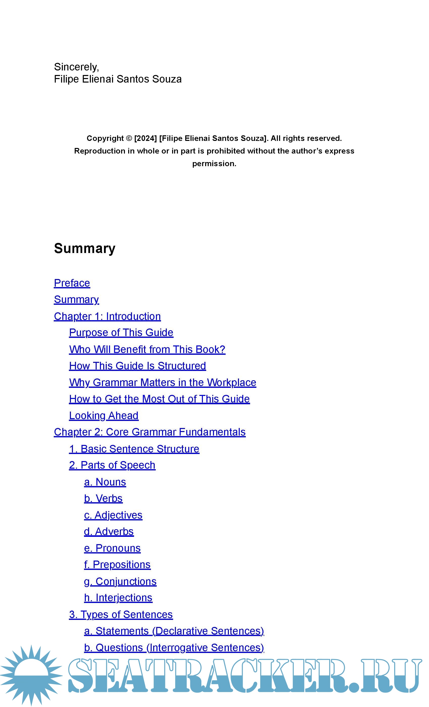 Year: 2024 Language: English Author: Santos Souza Genre: Textbook Publisher: Independently published Edition: 2024 Edition ISBN: 9798345935552 Format: EPUB Quality: eBook Pages count: 101 Description: "Mastering Professional English Grammar: A Comprehensive Guide for Clarity and Precision" is your essential resource for effective communication in today’s business environment. Designed for professionals and learners, this ebook covers every aspect of English grammar necessary to convey ideas clearly, accurately, and with authority. Key Features of This Guide: • Grammar Essentials: Learn the fundamentals of English grammar, from nouns and verbs to complex sentence structures, ensuring a strong linguistic foundation. • Advanced Sentence Clarity: Improve sentence structure, avoid ambiguity, and create polished sentences that resonate in professional contexts. • Professional Tone & Style: Master formal writing techniques, active vs. passive voice, and adjust your tone to suit various audiences. • Idioms, Phrasal Verbs, and Collocations: Incorporate natural, fluent expressions into your writing to sound polished and engaging. • Proofreading and Editing: Follow structured steps for reviewing and refining your work, ensuring error-free, high-quality communication. Whether you’re preparing reports, drafting emails, or engaging with clients, this ebook provides the tools to write with confidence and professionalism. With straightforward explanations and practical examples, "Mastering Professional English Grammar" supports you in achieving clarity, precision, and impact in all your English-language interactions. Perfect for professionals, students, and English learners aiming for excellence in business communication, this ebook will help you transform your writing and enhance your career prospects.
