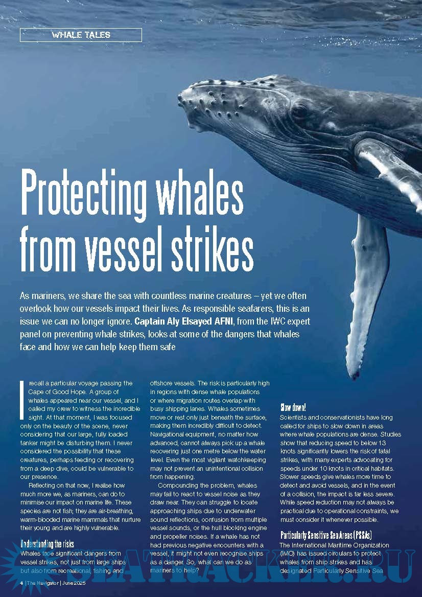 In this edition of The Navigator, we focus on detecting, protecting and avoiding whales at sea. Avoiding whale strikes is the collective responsibility of all stakeholders within the shipping industry. According to the IMO and NOAA (National Oceanic and Atmospheric Administration), all sizes and types of ship or vessel, including recreational, commercial and governmental vessels have the potential to collide with nearly all kinds of marine species, including whales. Damage to vessels notwithstanding, the whale will likely come off the worse in the exchange. The increase in the number, size and speed of ships means that the threat of ships striking whale and other marine species is also getting bigger.