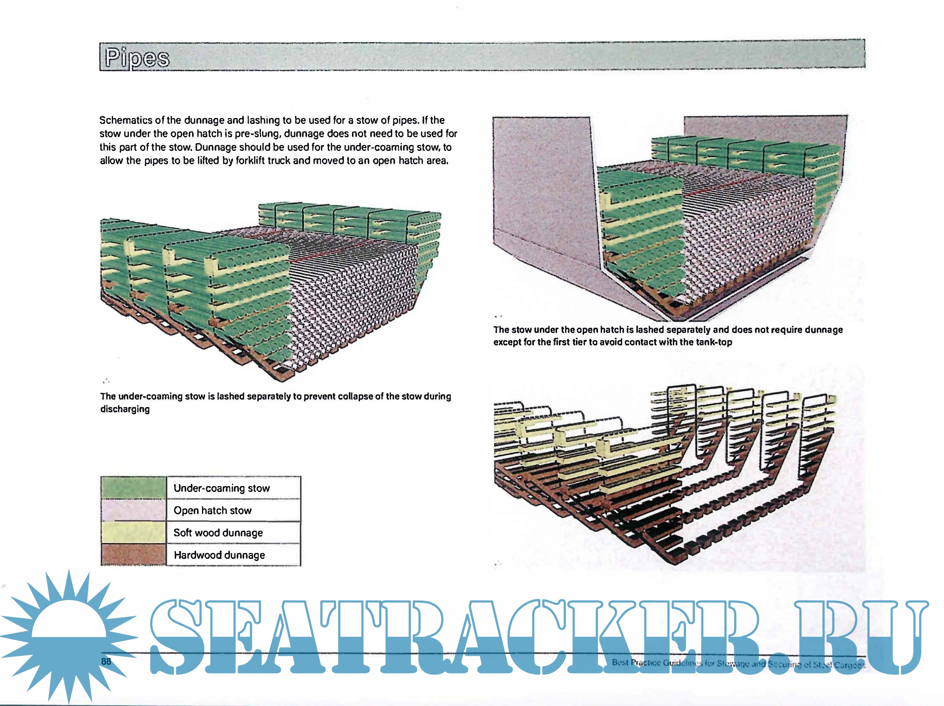 This publication sets out best practice guidelines for the proper stowage and safe securing of steel cargoes. Each chapter is colour coded and focuses on a different type of steel cargo, providing advice on bundling, dunnaging, lashing and stowage. Each chapter also contains diagrams that demonstrate best practice in action and highlight dangerous practices to be avoided.
