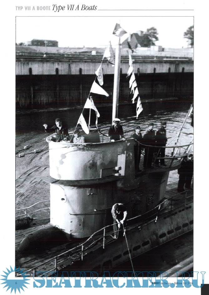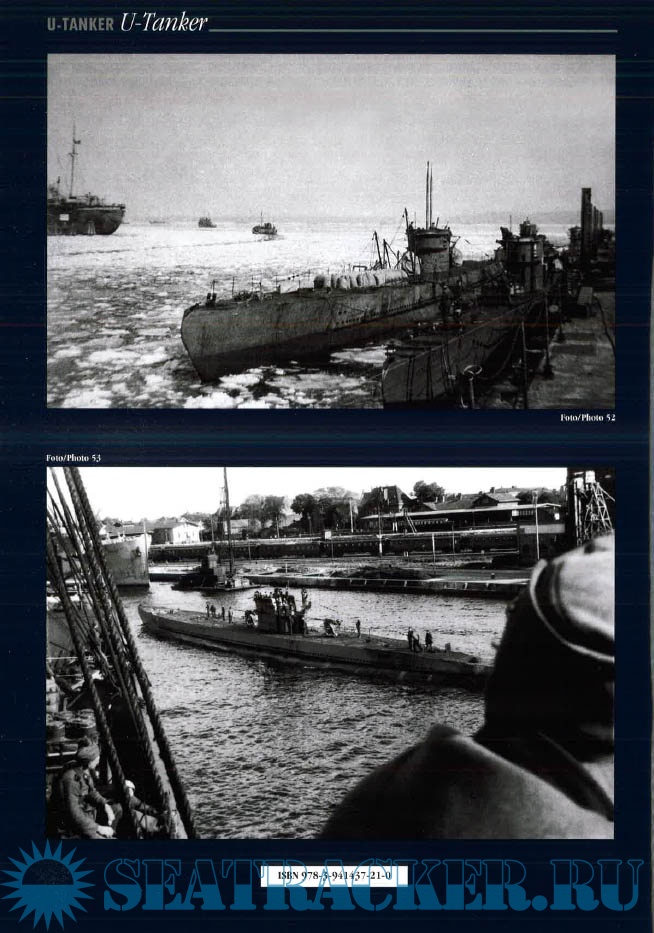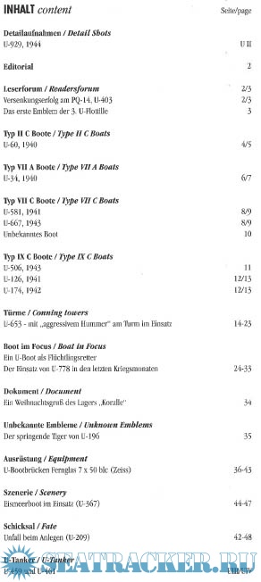 50 pages, 55 photos - thereof 5 in colour, 2 coloured conning tower sideviews (U-653 and U778), 1 coloured map, 3 coloured emblems, 1 coloured document, Readerforum Conning U-653 – In Action with the “Aggressive Lobster” on its Conning Tower A Christmas Greeting from “Camp Coral” Unknown U-196’s Leaping Tiger (U-Kentrat) Boat in A U-Boat Rescues Refugees - U-778’s Operations During the Final Months of the War 7 x 50 blc (Zeiss) U-Boat Binoculars Polar Sea Boat in Action (U-367) Accident while Docking (U-209) as well as photos from different types and more information