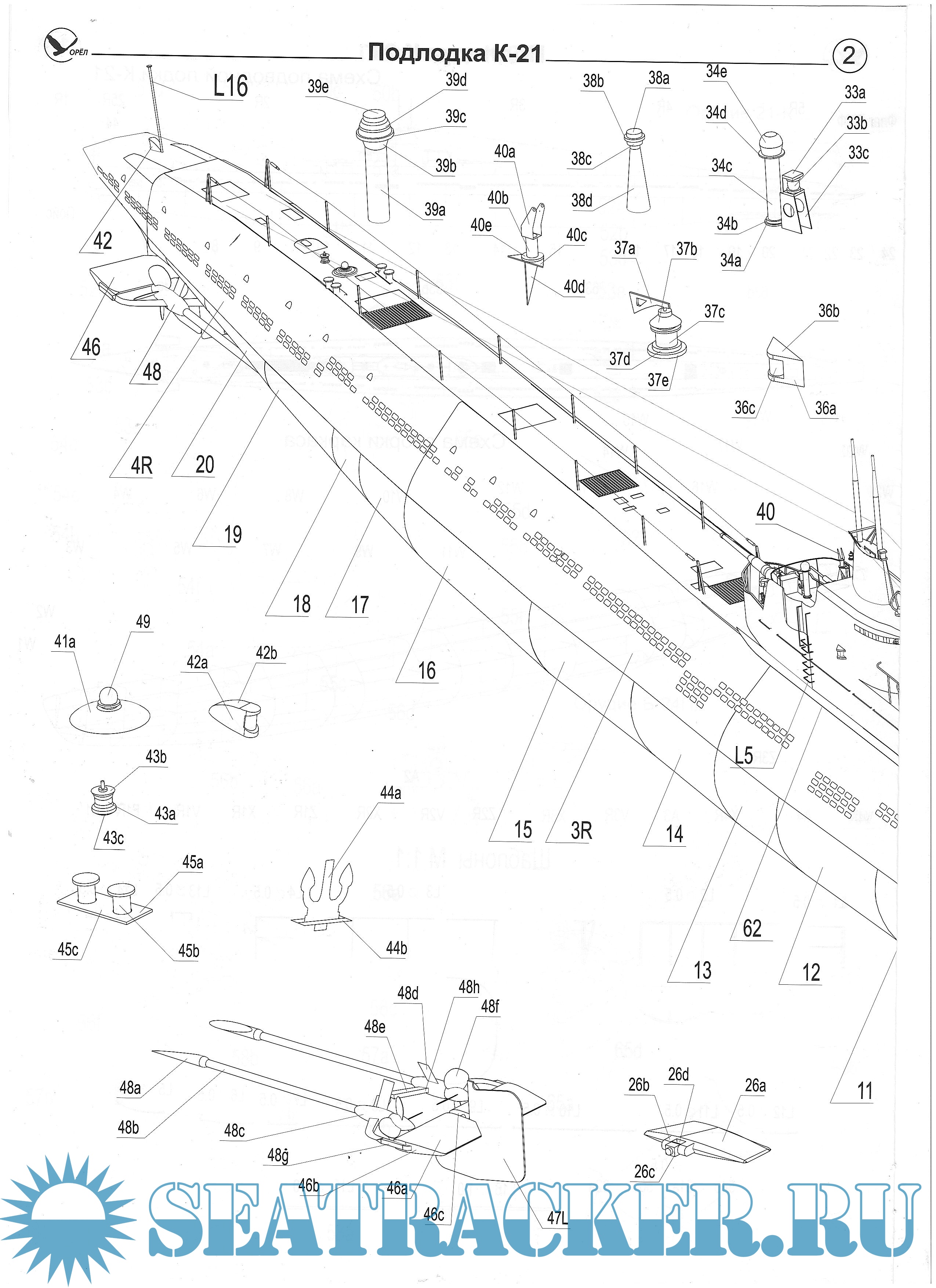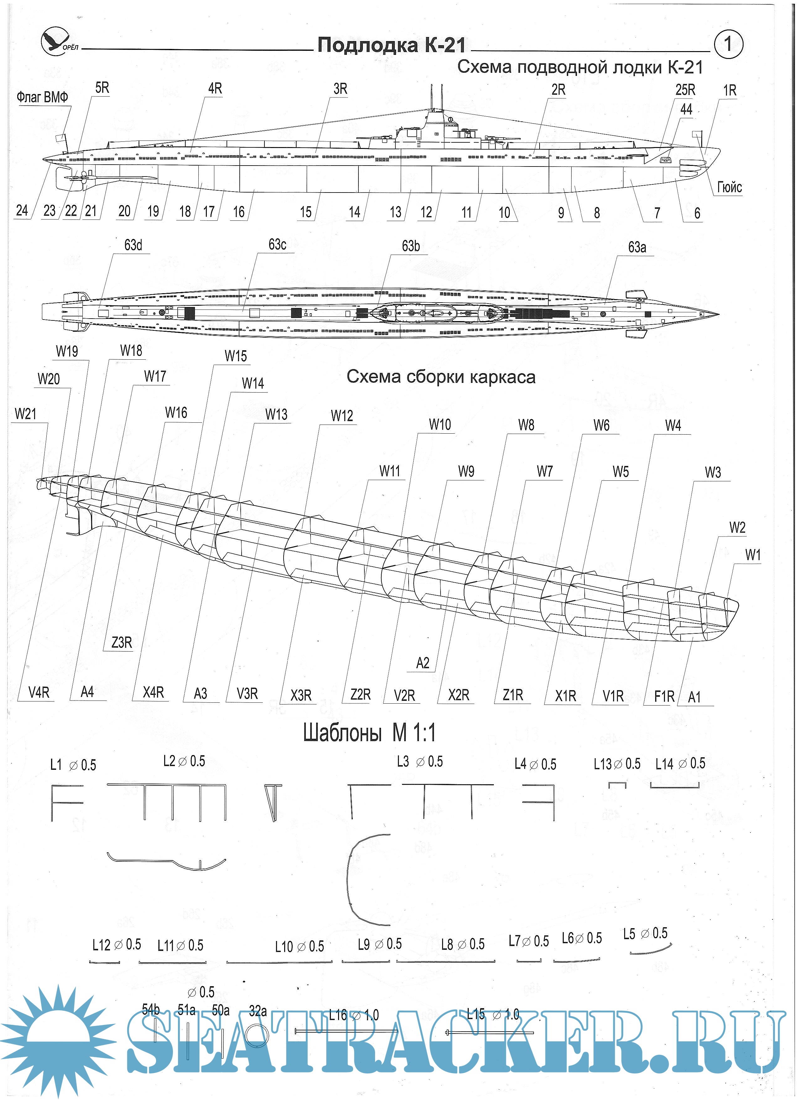 22 листа цветных выкроек и инструкций для изготовления бумажной модели подводной лодки K-21 год в масштабе 1:100