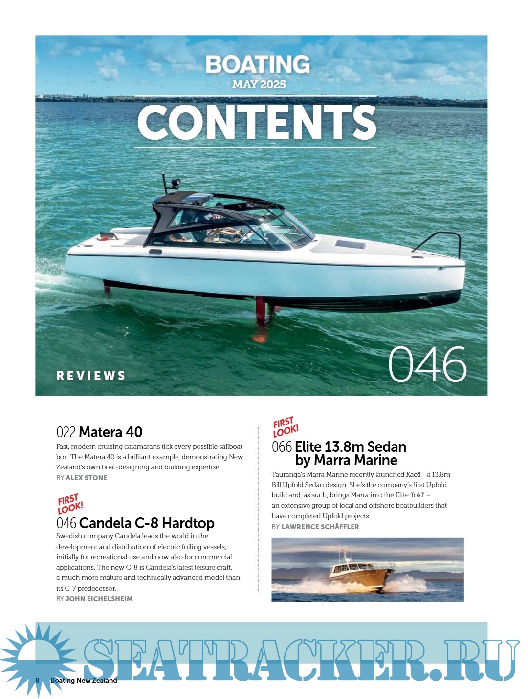 This issue features boat reviews of the Elite 13.8m Sedan Kaeā, set for the Marlborough Sounds; the practical Matera 40 catamaran; and the innovative electric Candela C-8. Features include the Yates family’s historic launch Silver Bell, Kawau Island’s sewage problem, and Tony Singe’s 50 years in the marine industry. Haines Hunter’s new vacuum-infused hardtops, fishing tackle tips, and repowering the Pelin Challenger are also covered. There’s a trailer boat trip to Tennyson Inlet, a preview of the 2025 Australian Wooden Boat Festival, a comparison of electric vs petrol outboards, and Yamaha’s hydrogen outboard debuting in New Zealand.