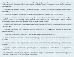 Описание: Журнал «Верфь моделиста» выходит в электронном формате со свободным бесплатным распространением. Журнал ориентирован в первую очередь на начинающих моделистов, но надеемся и более опытные смогут найти для себя интересную информацию.