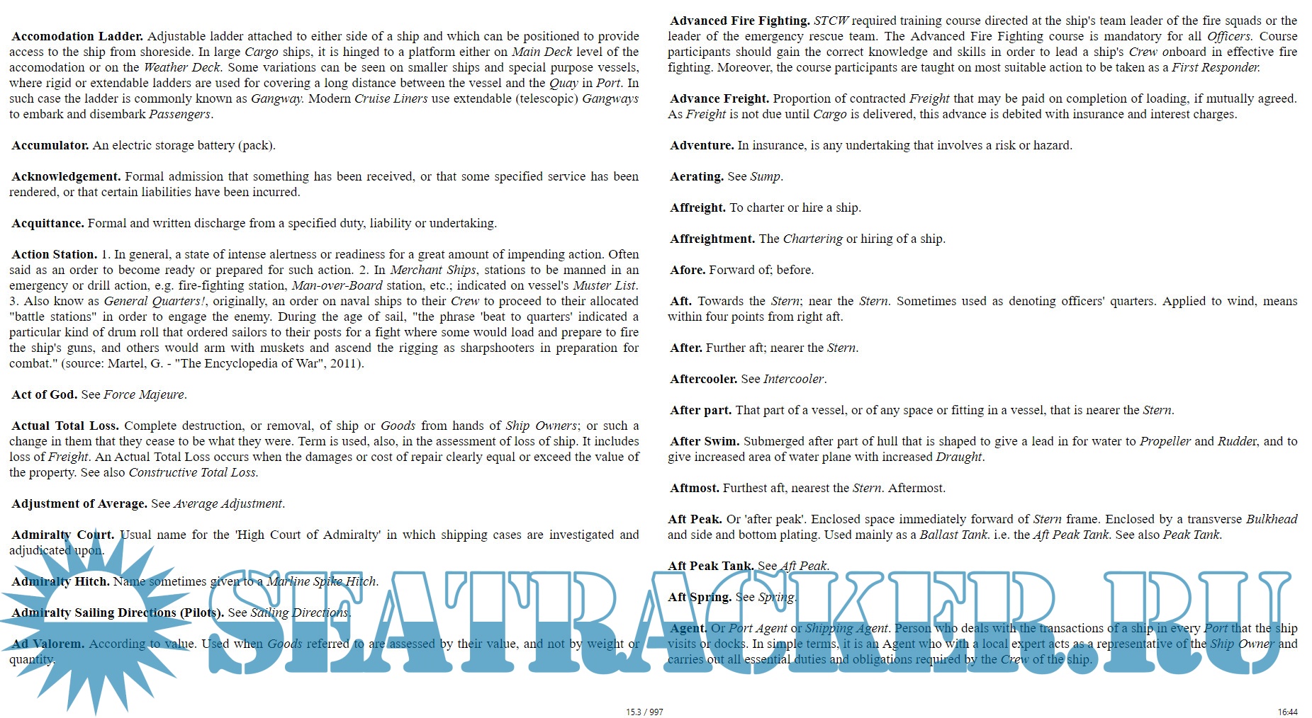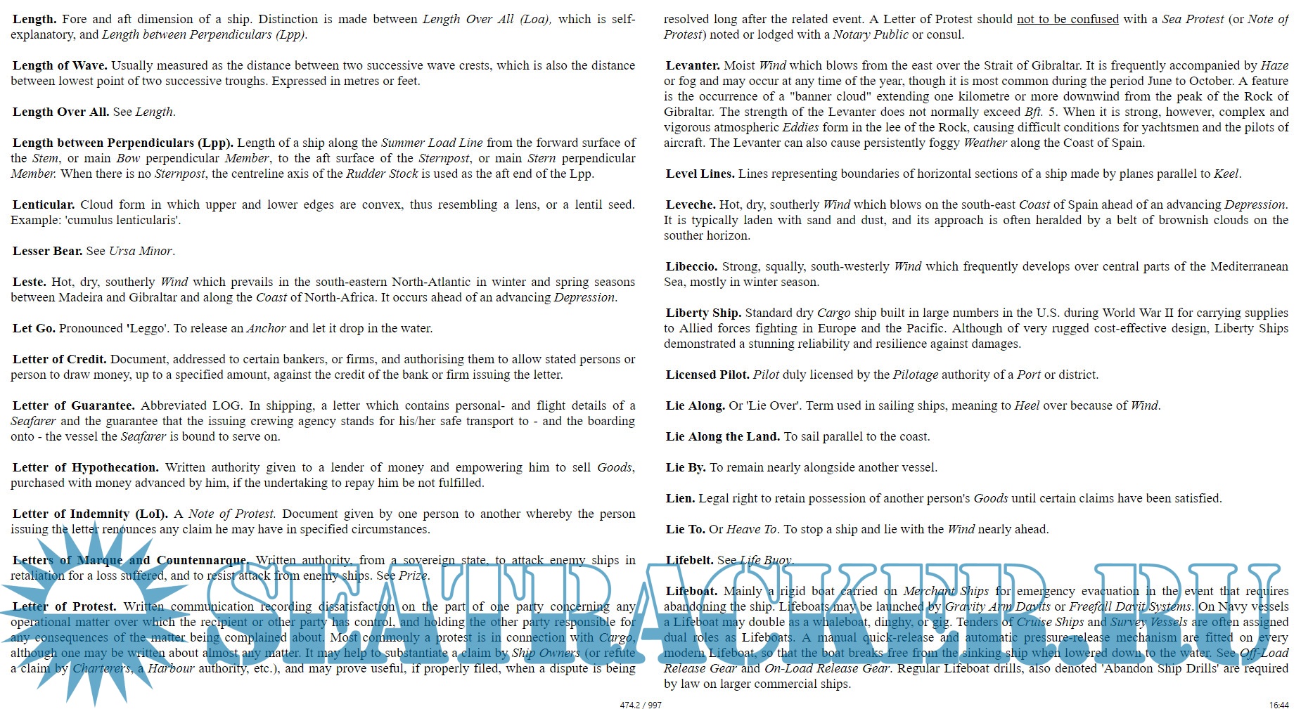 Year: 2021 Language: english Author: Peter Ernst Paul Heimstaedt Edition: 1st Format: EPUB Quality: eBook Pages count: 997 Description: "Captain Pete's Marine Knowledge Base" is a concise glossary of terms and phrases widely used in today's shipping industry. It has been compiled for purposes of education, competence development and occupational awareness in the professional maritime field. Although primarily addressed to seafarers of all nations and ranks, this vocabulary may certainly be helpful also for those who have an interest in using the included information for research and studies. However, the definitions and explanations provided shall not be construed as to constitute legal or technical advice. As a knowledge base, this special dictionary is aimed at promoting education through the spread of expert information and by annotating technical and scientific principles. Therefore, it is released and added to the public domain.