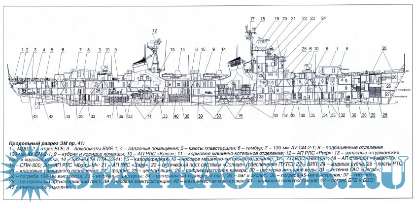 Описание: Дальнейшим развитием отечественных эскадренных миноносцев проекта 30-бис стал корабль, оснащенный новыми образцами оружия и техники, созданными уже в послевоенный период.