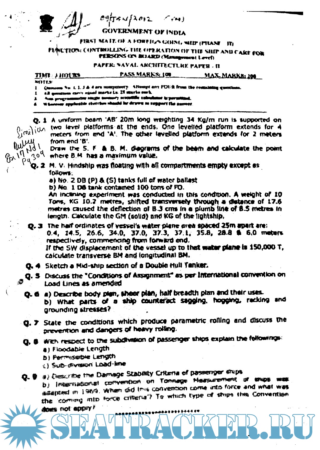 Description: Question paper set for Naval Architecture II Mercantile Marine Department (MMD), India Exams for Phase II - Chief Mate (F.G.).