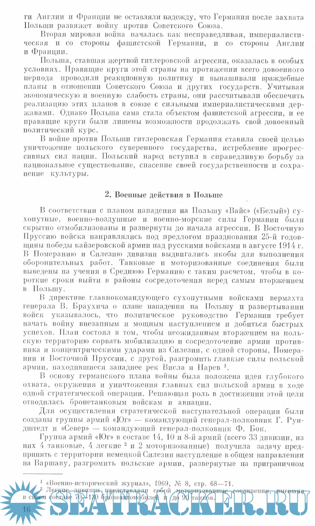 Год выпуска: 1973 - 1982 Язык: Русский Автор: Коллектив авторов Жанр: Историческое Издательство: Воениздат Формат: DjVu Качество: Отсканированные страницы Количество страниц: 595 Описание: Первый том охватывает период с конца первой мировой войны до осени 1935 г. Его первая часть посвящена зарождению войны в системе мирового империализма, показу фашизма как ударной силы империализма и милитаризма, истории возникновения первых очагов новой мировой войны. Во второй части тома раскрывается всемирно-историческое значение строительства социализма в СССР, развитие его Вооруженных Сил, напряженная борьба миролюбивых народов во главе с Советским Союзом против опасности новой мировой войны. Второй том посвящен событиям, связанным с непосредственной подготовкой второй мировой войны империалистическими государствами, переходом европейского фашизма к открытой вооруженной агрессии, разоблачением политики попустительства агрессорам со стороны Англии, Франции и США. Третий том рассматривает военные действия в Европе, непосредственную подготовку фашистской Германии к нападению на СССР и подготовку Советского Союза к отражению агрессии. Четвертый том посвящен политическим и военным событиям, связанным с расширением масштабов войны в результате вероломного нападения Германии на Советский Союз и агрессии Японии против США и Англии. Пятый том рассматривает военные действия летом и осенью 1942 г., и ходе которых усилиями советского народа были сорваны планы фашистской Германии сокрушить СССР в этом году и расширить фронт агрессии в странах Ближнего и Среднего Востока, а также подготовлены условия для коренного перелома во второй мировой войне. Шестой том охватывает события важнейшего этапа минувшей войны, когда начался и нарастал коренной перелом в пользу антигитлеровской коалиции. В томе показана решающая роль СССР и его Вооруженных Сил в созданий этого перелома. Седьмой том посвящен исследованию военных, политических и экономических процессов, определивших завершение коренного перелома в войне, показу решающей роли СССР в этом переломе и началу распада фашистского блока. Восьмой том рассматривает события первой половины 1944 г., в результате которых были сорваны планы фашистской Германии на затягивание войны путем стабилизации советско-германского фронта. Освещаются мероприятия союзников по подготовке открытия второго фронта в Европе. Девятый том исследует крупнейшие победы Советских Вооруженных Сил, которые привели к полному изгнанию фашистских агрессоров с советской территории и освобождению стран Восточной и Юго-Восточной Европы. В томе освещаются события, связанные с открытием второго фронта союзниками, военные действия на Тихом океане и в Азии. Десятый том посвящен завершающим победам Советских Вооруженных Сил и войск союзников над гитлеровской армией, приведшим к безоговорочной капитуляции фашистской Германии, раскрытию ведущей роли Советского Союза в принятии решений на конференциях в Ялте, Потсдаме и Сан-Франциско по послевоенному устройству мира. Одиннадцатый том раскрывает агрессивную политику японского милитаризма, разгром и безоговорочную капитуляцию Японии, разоблачает реакционную сущность атомной стратегии США, показывает освободительную миссию Советских Вооруженных Сил на Дальнем Востоке. Двенадц