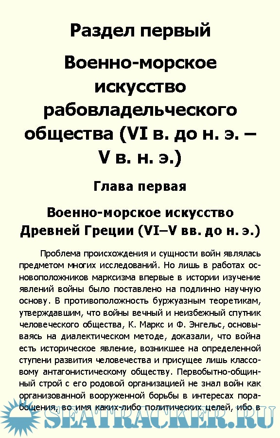 Содержание Раздел первый ВОЕННО-МОРСКОЕ ИСКУССТВО РАБОВЛАДЕЛЬЧЕСКОГО ОБЩЕСТВА (VI в. до н.э. — V в. н.э.) Глава первая ВОЕННО-МОРСКОЕ ИСКУССТВО ДРЕВНЕЙ ГРЕЦИИ (VI—V вв. до н.э.) Глава вторая ВОЕННОЕ И ВОЕННО-МОРСКОЕ ИСКУССТВО ДРЕВНЕГО РИМА И КАРФАГЕНА (VI в. до н.э. — V в. н.э.) Раздел второй ВОЕННО-МОРСКОЕ ИСКУССТВО ФЕОДАЛЬНОГО ОБЩЕСТВА (VI—ХУ1П вв.) Глава третья ВОЕННО-МОРСКОЕ ИСКУССТВО ПЕРИОДА ВОЗНИКНОВЕНИЯ И РАЗВИТИЯ ФЕОДАЛЬНЫХ ОТНОШЕНИЙ НА РУСИ (VI—XII вв.) Глава четвертая РУССКОЕ ВОЕННО-МОРСКОЕ ИСКУССТВО ПЕРИОДА ФЕОДАЛЬНОЙ РАЗДРОБЛЕННОСТИ. АЛЕКСАНДР НЕВСКИЙ. ДИМИТРИЙ ДОНСКОЙ (XII—XIV вв.) Глава пятая ВОЕННО-МОРСКОЕ ИСКУССТВО СТРАН ЗАПАДНОЙ ЕВРОПЫ В ВОЙНАХ ПЕРИОДА ПЕРВОНАЧАЛЬНОГО КАПИТАЛИСТИЧЕСКОГО НАКОПЛЕНИЯ (XV— XVII вв.) Глава шестая ВОЕННО-МОРСКОЕ ИСКУССТВО В ВОЙНАХ ПЕРИОДА ОБРАЗОВАНИЯ И УКРЕПЛЕНИЯ РУССКОГО ЦЕНТРАЛИЗОВАННОГО ГОСУДАРСТВА. ИВАН IV (XVI—XVII вв.) Глава седьмая ВОЕННОЕ И ВОЕННО-МОРСКОЕ ИСКУССТВО В АЗОВСКИХ ПОХОДАХ ПЕТРА I И В СЕВЕРНОЙ ВОЙНЕ 1700—1721 гг. СОЗДАНИЕ РЕГУЛЯРНОЙ АРМИИ И ФЛОТА В РОССИИ. ПЕТР I КАК ПОЛКОВОДЕЦ И ФЛОТОВОДЕЦ Глава восьмая ВОЕННО-МОРСКОЕ ИСКУССТВО ИНОСТРАННЫХ ГОСУДАРСТВ В АНГЛО-ФРАНЦУЗСКИХ ВОЙНАХ XVIII в Глава девятая ВОЕННОЕ И ВОЕННО-МОРСКОЕ ИСКУССТВО РОССИИ В ВОЙНАХ ВТОРОЙ ПОЛОВИНЫ XVIII в. СОЗДАНИЕ ЧЕРНОМОРСКОГО ФЛОТА. ВЫДАЮЩИЙСЯ РУССКИЙ ПОЛКОВОДЕЦ РУМЯНЦЕВ. ВЕЛИКИЙ РУССКИЙ ПОЛКОВОДЕЦ СУВОРОВ. ВЫДАЮЩИЙСЯ РУССКИЙ ФЛОТОВОДЕЦ УШАКОВ ХРОНОЛОГИЧЕСКАЯ ТАБЛИЦА