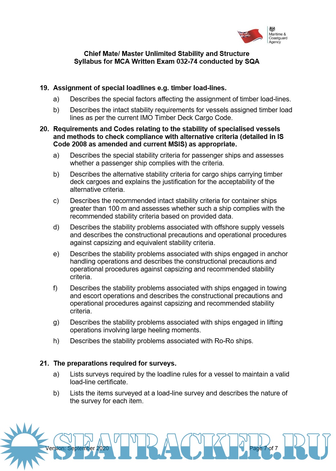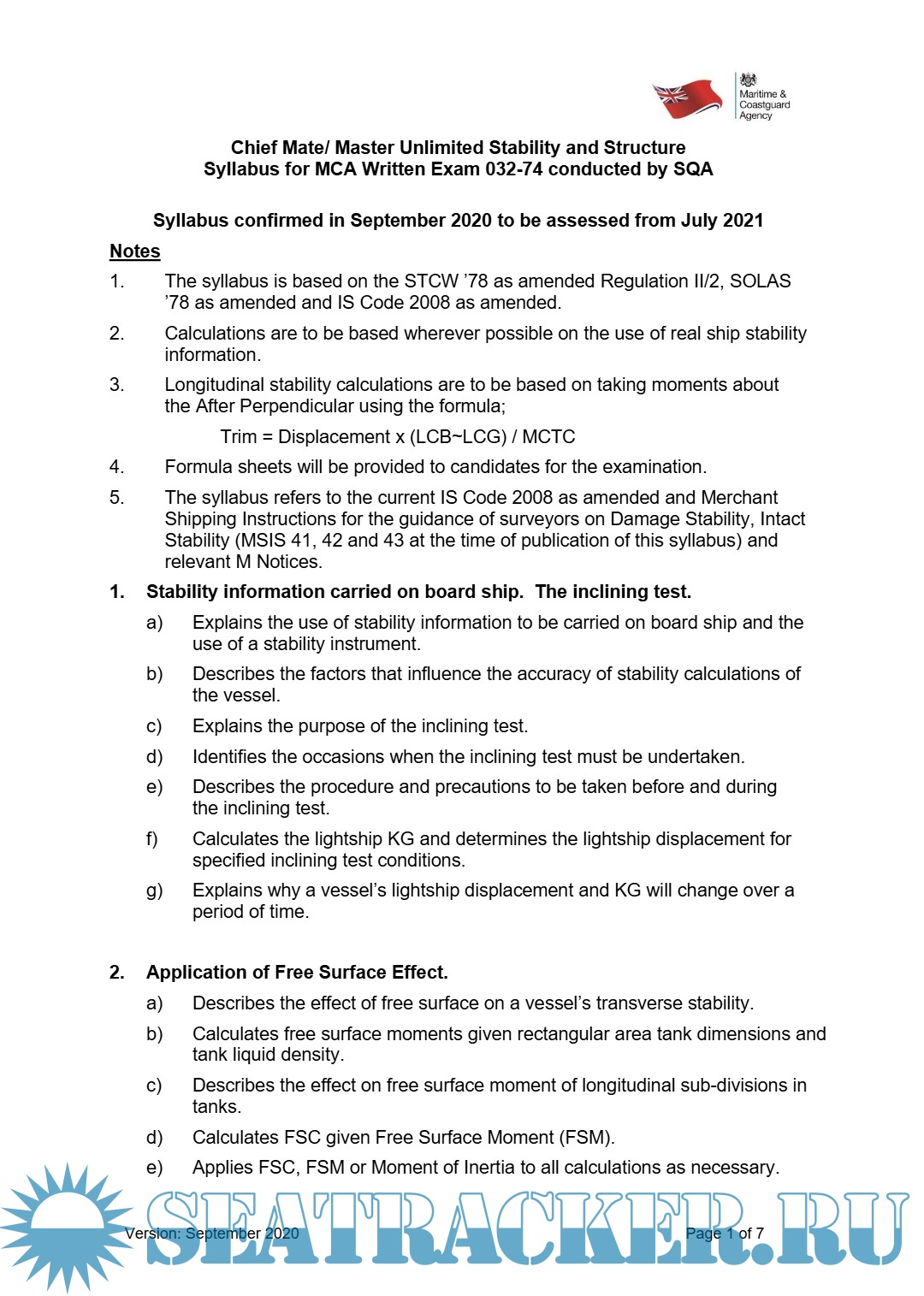 Chief Mate/ Master Unlimited Stability and Structure Syllabus for MCA Written Exam 032-74 by SQA