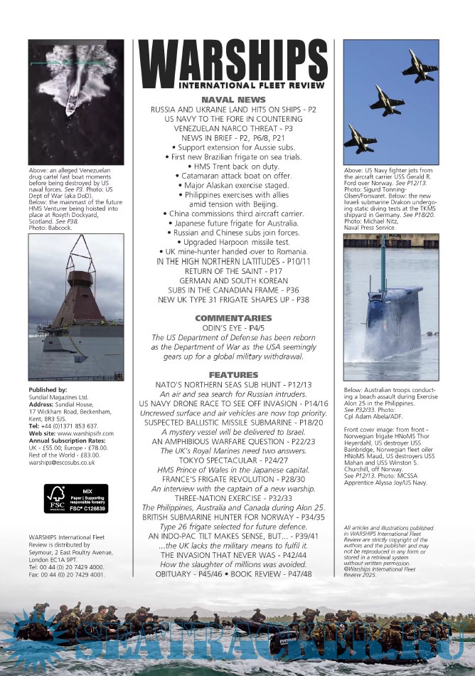 Year: 2025 Language: English Author: Iain Ballantyne (Editor) Genre: Periodical publication Edition: 2025-10 Format: PDF Quality: eBook Pages count: 52 Description: Warships IFR puts the spotlight on the latest developments in the world’s navies. It covers current defence issues and has comments by leading analysts. The magazine regularly includes features on the Royal Navy and the US Navy in addition to incorporating news and features on all other navies across the globe. Warships IFR frequently carries in-depth articles on naval heritage.WARSHIPS International Fleet Review is published 12 times a year by Tandy Media Ltd who also publish Shipping Today & Yesterday (which provides news and features from the world of merchant shipping).