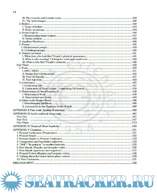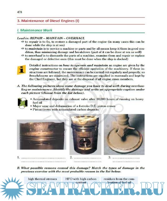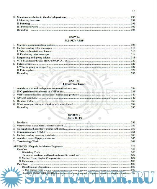 For the Marine Engineer cadets (=Μηχανικοί), their curriculum includes “selections” from the abovementioned 5 units per semester, plus “Appendix I: English for Marine Engineers”. The latter one is divided into 3 parts, each of which is scheduled to be taught in each of the A, B, and C semesters.
