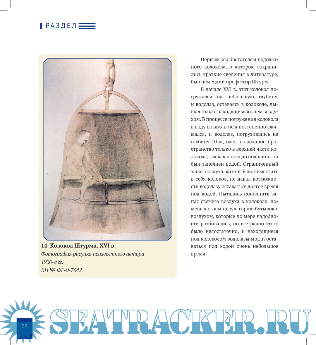 В данной работе систематизирована и представлена богатейшая коллекция водолазного снаряжения, инструментов для подводных работ, осветительных приборов, помп, средств связи и других атрибутов подводных работ (спасательных, поисковых технических, диверсионных и научноисследовательских) за всю историю музея с 1709 года по настоящее время.