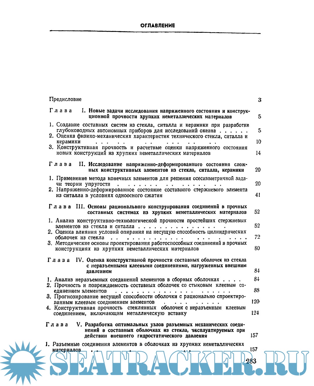 Год выпуска: 1983 Язык: Русский Автор: Квитка А.Л., Дьячков И.И. Жанр: Техническая литература Издательство: НАУКОВА ДУМКА Формат: PDF Качество: Изначально компьютерное (eBook) Количество страниц: 284 Описание: В монографии изложено решение задачи конструкционной прочности неорганического стекла в составных оболочках с принципиально новыми типами неразъемных клеевых и разъемных механических соединений в условиях внешнего гидростатического давления. Предложена методика рационального проектирования соединений в прочных составных системах из хрупких материалов типа стекла, ситалла, керамики. Приведены результаты, доказывающие реальную возможность использования серийно выпускаемых промышленностью изделий из стекла в составных оболочках, надежно эксплуатируемых при высоком внешнем давлении. Даны примеры эффективного использования разработанных конструкций в виде натурных океанологических объектов: элементов плавучести, герметичных контейнеров, прочных корпусов и автономных элементов глубоководных станций. Д ля научных и инженерно-технических работников, занимающихся вопросами конструкционной прочности и разрушения хрупких неметаллических материалов.