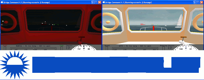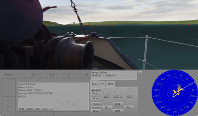 Bridge Command is very highly flexible, with the environmental model, ships, buoys, individual scenarios and almost all aspects of the simulation being configurable to your own needs. Bridge Command can be run on a single computer, with no additional devices needed. It can also be run with physical controls, and has an interface where a trainer can control scenarios in order to carry out training exercises, from a second computer. It can display on a single screen, or can display a full panoramic view across multiple screens using multiple computers. The radar picture is simulated in real-time, and includes standard marine radar controls such as gain and clutter, as well as features such as parallel indexes and ARPA contact tracking.