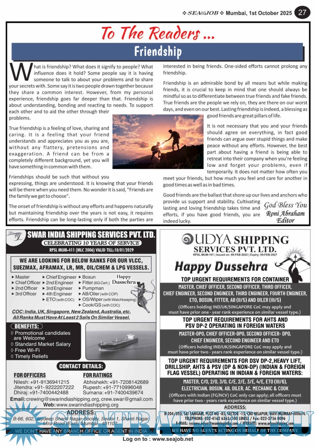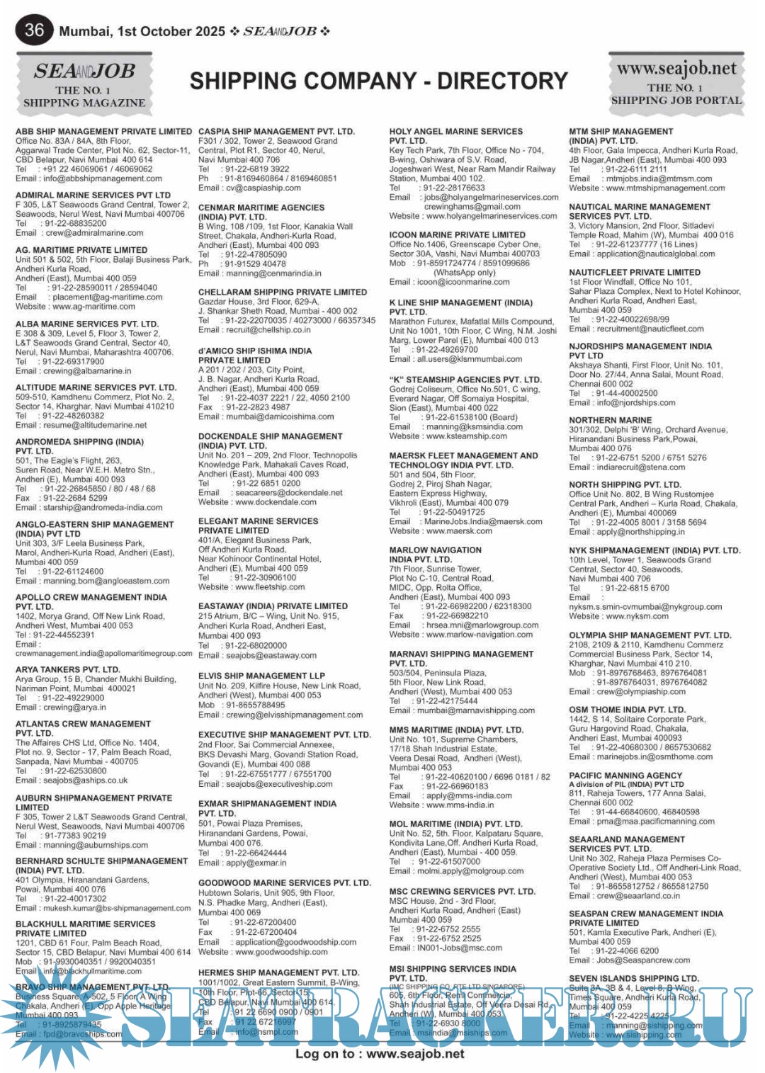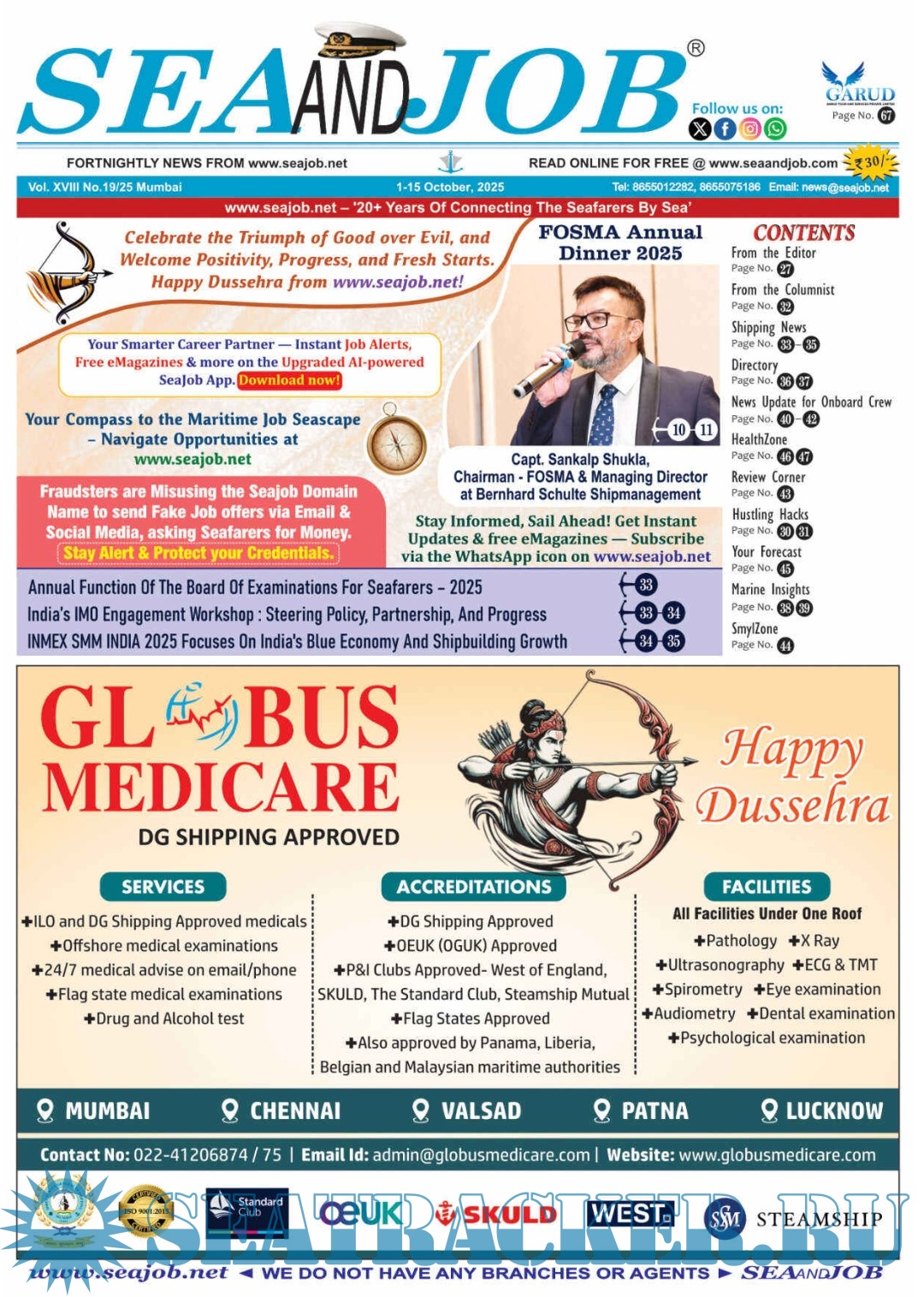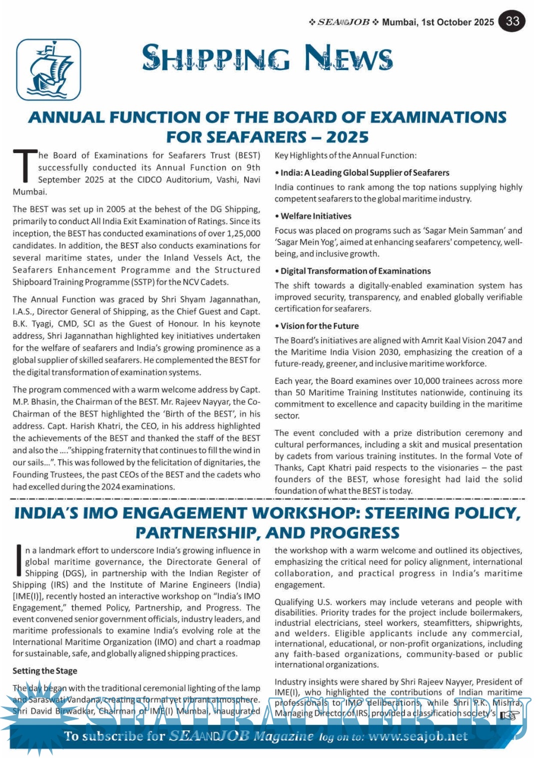 Description: The Sea and Job magazine launched in May 2007, was the second venture of Sea Line Group succeeding 'seajob.net' bringing the much renowned essence to the Group, the Sea and Job Magazine quickly gained popularity, becoming the No. 1 Shipping Magazine that came to be widely circulated all over India.Sea and Job over the years has evolved as the most trusted, ethical, objective and read maritime publication that possesses a large database of subscribers from various verticals in the industry.The magazine provides informative and interesting articles covering not just the shipping world but also the world outside it. Sea and Job is also a medium for the shipping/ manning companies to advertise marine jobs and also to promote their organization by publicizing internal activities like seminars, sports events and parties.Some notable endeavors of the magazine include the Know Your Recruiter Column, the Sailing Episodes Column and the Marine Insights section. The consistent efforts and the dedication to provide extraordinary services to the industry has resulted in the magnifying popularity and patronage of Sea and Job