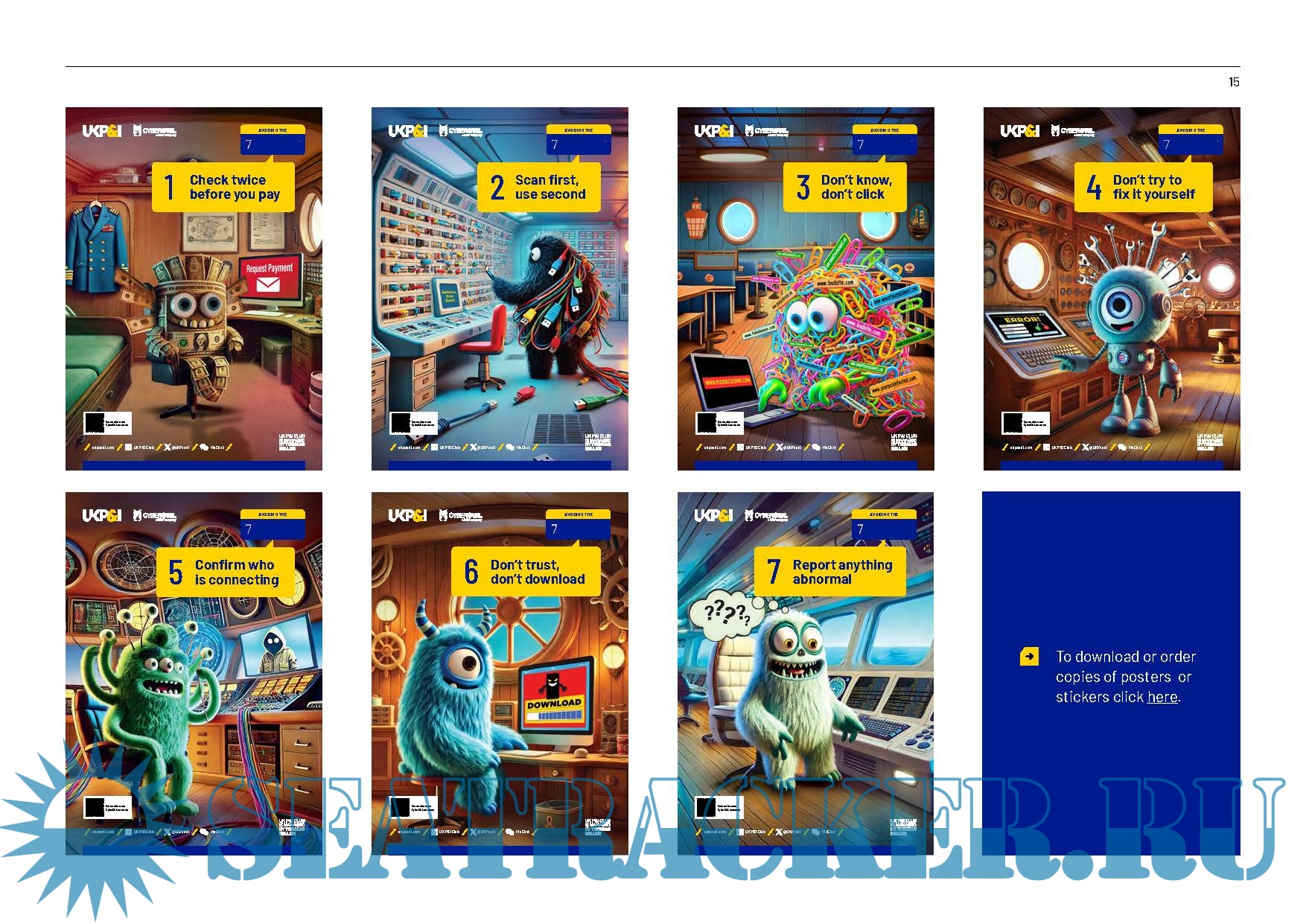 "7 deadly sins of cyber insecure behaviour" posters. Ensuring that basic cyber hygiene is maintained can go a long way towards keeping shipboard systems cyber safe. The crew have an important role to play in this. In order to ensure good hygiene, there are rules for each of the “7 deadly sins” of cyber insecure behaviour that crew can follow to significantly reduce cyber risk to shipboard systems. Each deadly sin is represented by a “cyber monster” that serves as a scary reminder.