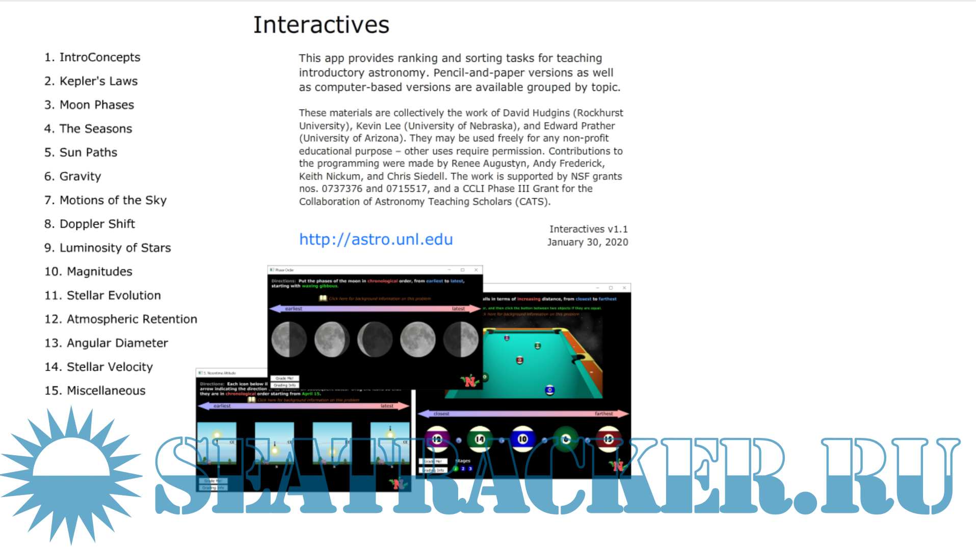 Year: 2020 Version: 1.1 Developer: University of Nebraska, University of Arizona, Rockhurst University Platform: Windows 64-bit OS compatibility: yes Localization: English Crack: Not needed Description: This app provides ranking and sorting tasks for teaching introductory astronomy. Pencil-and-paper versions as well as computer-based versions are available, grouped by topic. These materials are collectively the work of David Hudgins (Rockhurst University), Kevin Lee (University of Nebraska), and Edward Prather (University of Arizona). They may be used freely for any non-profit educational purpose; other uses require permission. Contributions to the programming were made by Renee Augustyn, Andy Frederick, Keith Nickum, and Chris Siedell. The work is supported by NSF grants nos. 0737376 and 0715517, and a CCLI Phase III Grant for the Collaboration of Astronomy Teaching Scholars (CATS).