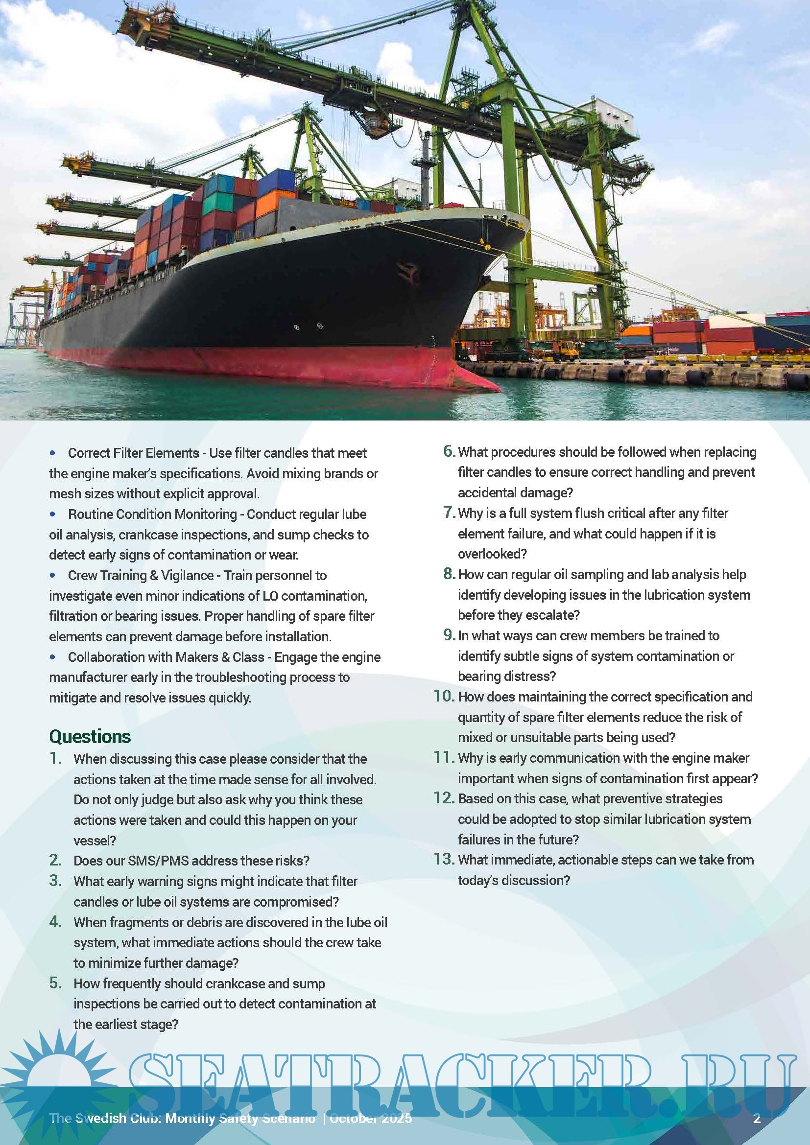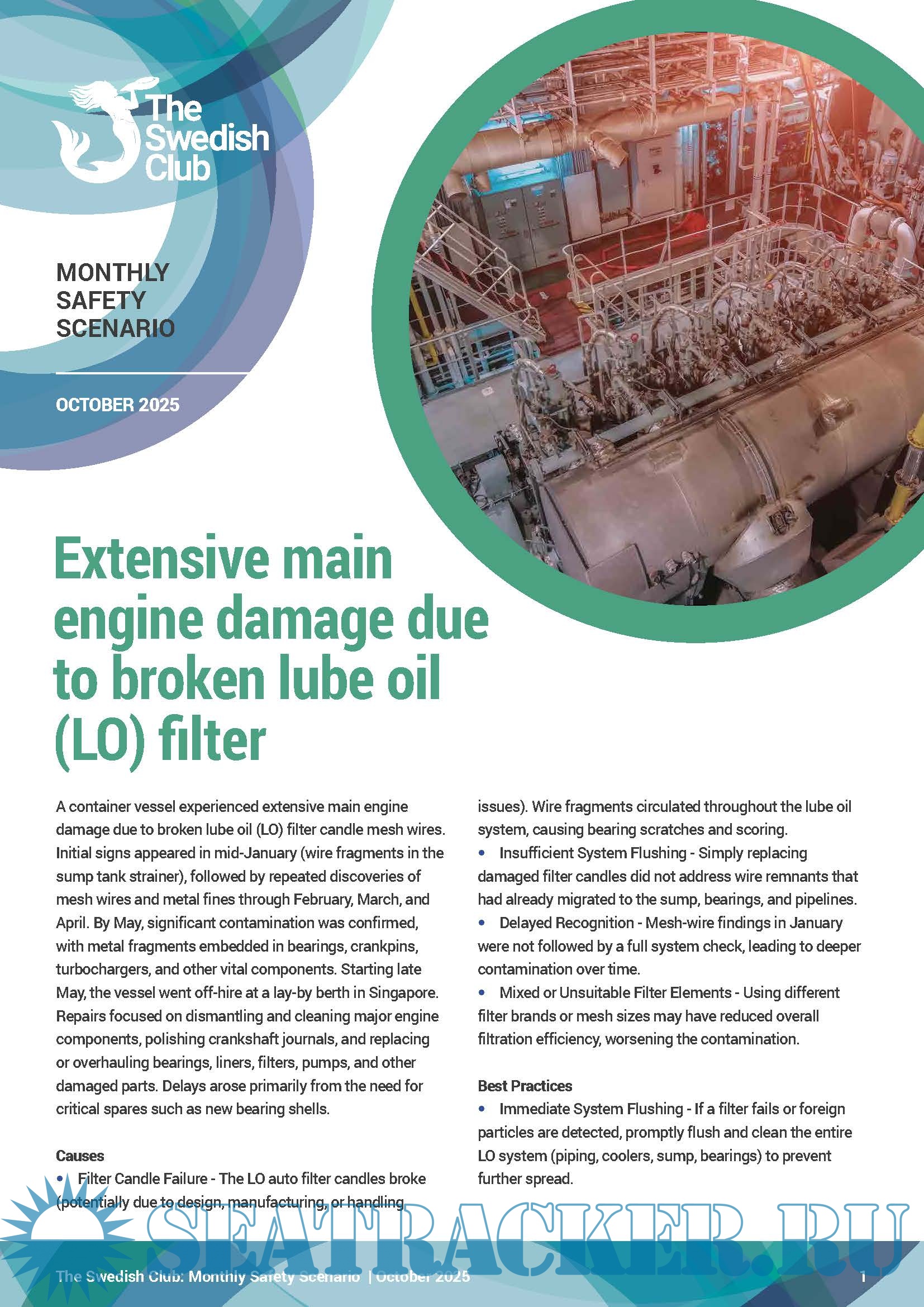 Year: 2025 Language: English Author: the Swedish Club Genre: Periodical publication Publisher: the Swedish Club Edition: October 2025 Format: PDF Quality: eBook Pages count: 2 Description: The Monthly Safety Scenario (MSS) is a Loss Prevention initiative to assist members in their efforts to comply with international safety regulations and to follow best practices. The Club is publishing, on a monthly basis, a new Monthly Safety Scenario (MSS) to assist owners in their efforts of complying with the above regulations. Alternative scenarios will be uploaded in SCOL. It is easy to download the MSS and enter the written conclusions from the meeting and send feedback to the shore-based organisation. Issue October, 2025 | Extensive main engine damage due to broken lube oil (LO) filter. We look at a case where a container vessel suffered severe main engine damage caused by broken lube oil (LO) filter candle mesh wires. The scenario follows how early warning signs were detected but continued contamination led to widespread damage to bearings, crankpins, and other vital components eventually taking the vessel off-hire for extensive repairs in Singapore. Under the ISM requirement, owners are obliged to carry out monthly safety meetings or safety committee meetings onboard their vessels. This obligation stems from Chapter 5 of the ISM Code: “Master’s responsibility and authority” and furthermore from “5.1.2, motivating the crew in the observation of that policy”. The obligation can also be derived from the Code of “Safe Working Practices for Merchant Seamen”, where it is stated that the safety committee should meet regularly: “3.13.2, The frequency of meetings will be determined by circumstances but as a general guideline, the committee should meet about every 4-6 weeks”.