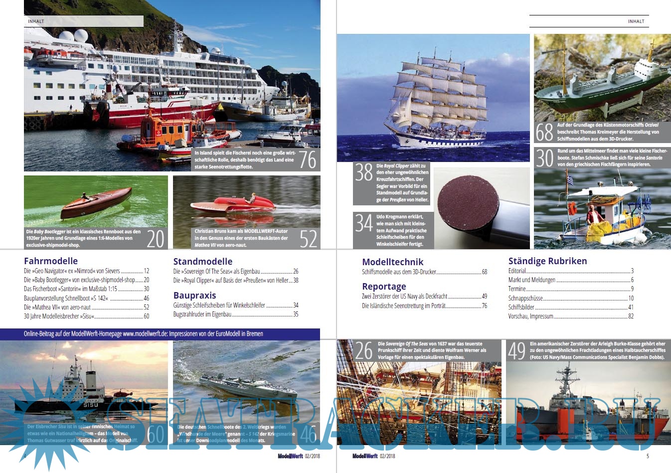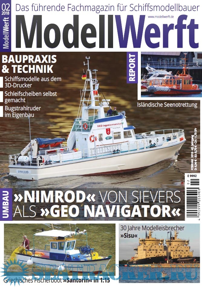 Year: 2018 Language: German Author: Eric Schafenrort (Redaktor) Genre: Periodical publication Edition: 2018-02 Format: PDF Quality: eBook Pages count: 84 Description: Das führende Fachmagazin für Schiffsmodellbauer. Egal ob Stand- oder Fahrmodell, ob kleines Segelboot oder gigantisches Kreuzfahrtschiff. Die Modellwerft informiert über Neuheiten, hilft mit Bautipps und fasziniert mit besonderen Reportagen.
