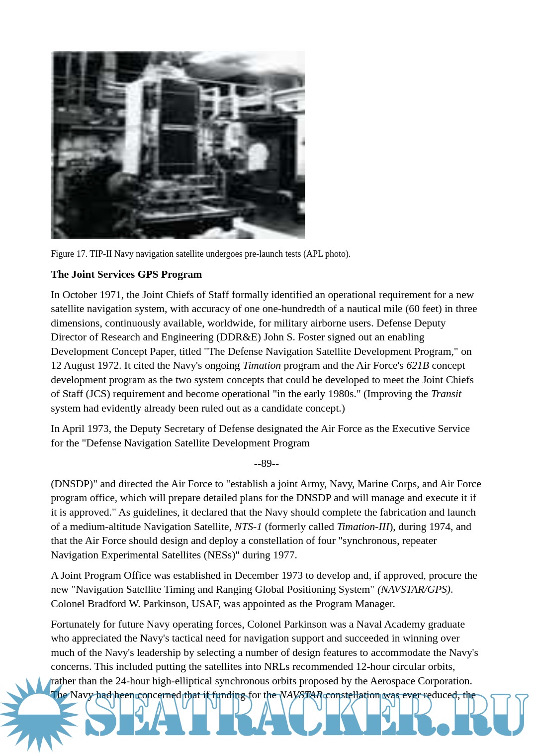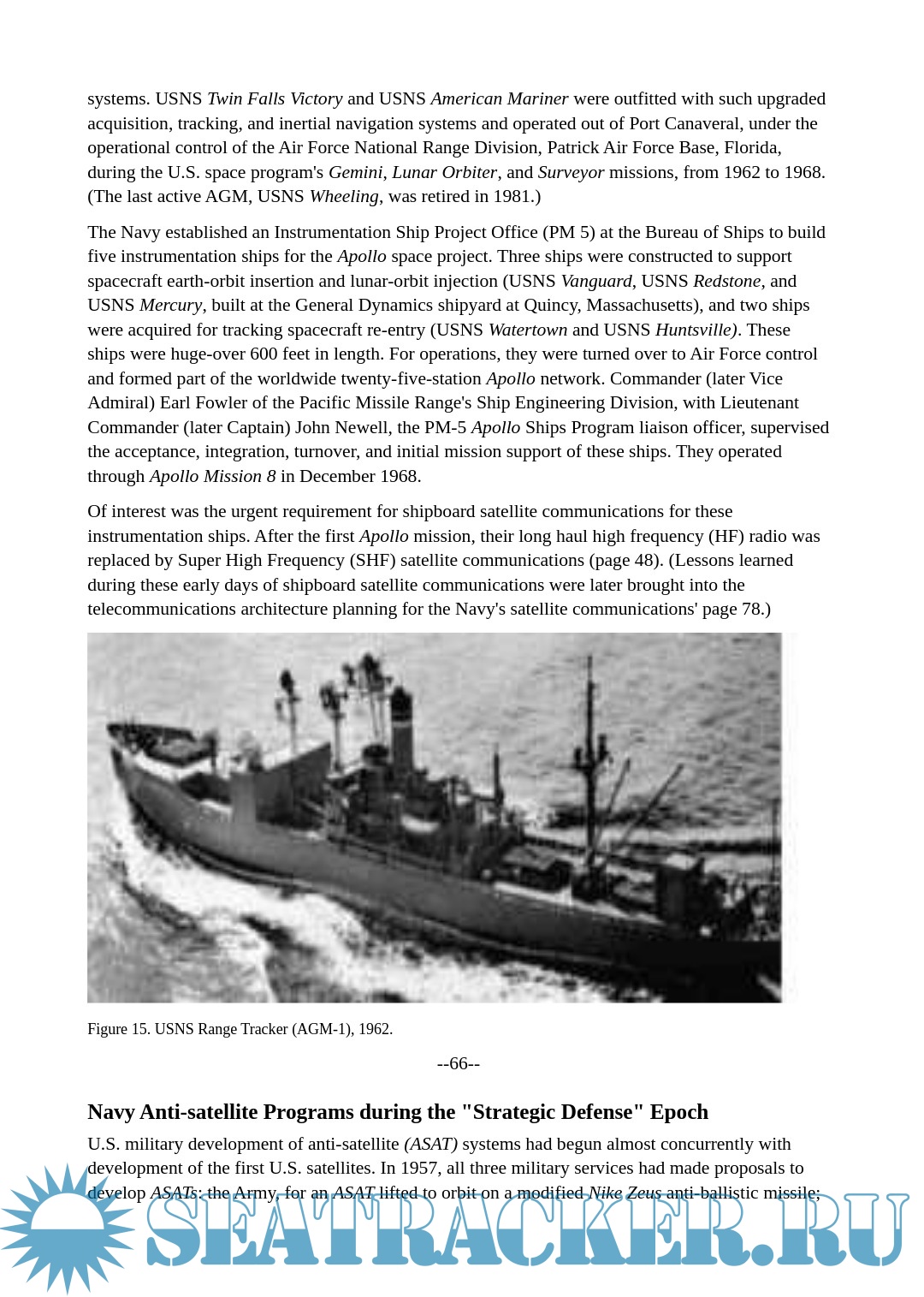 In today's multi-dimensional environment it is important to recognize the historic role the Navy has played in space systems development. In 1958 the Naval Research Laboratory successfully launched one of the earliest man-made satellites (following the Soviet Union's two Sputniks and the U.S. Army's Redstone missile). During the same year, the Navy's Space Surveillance System was fielded to detect and track all man-made objects in space, and provide data for day-to-day