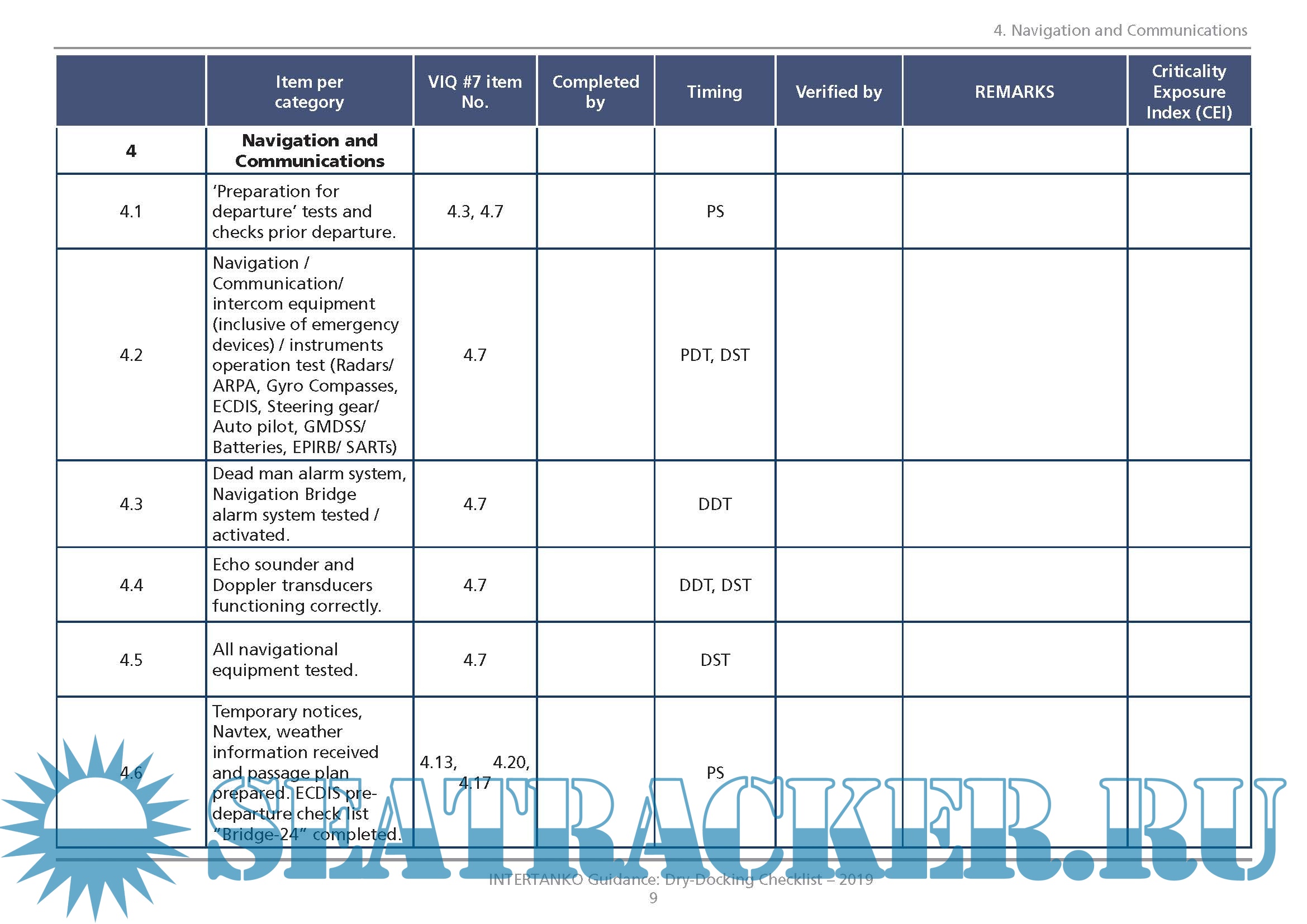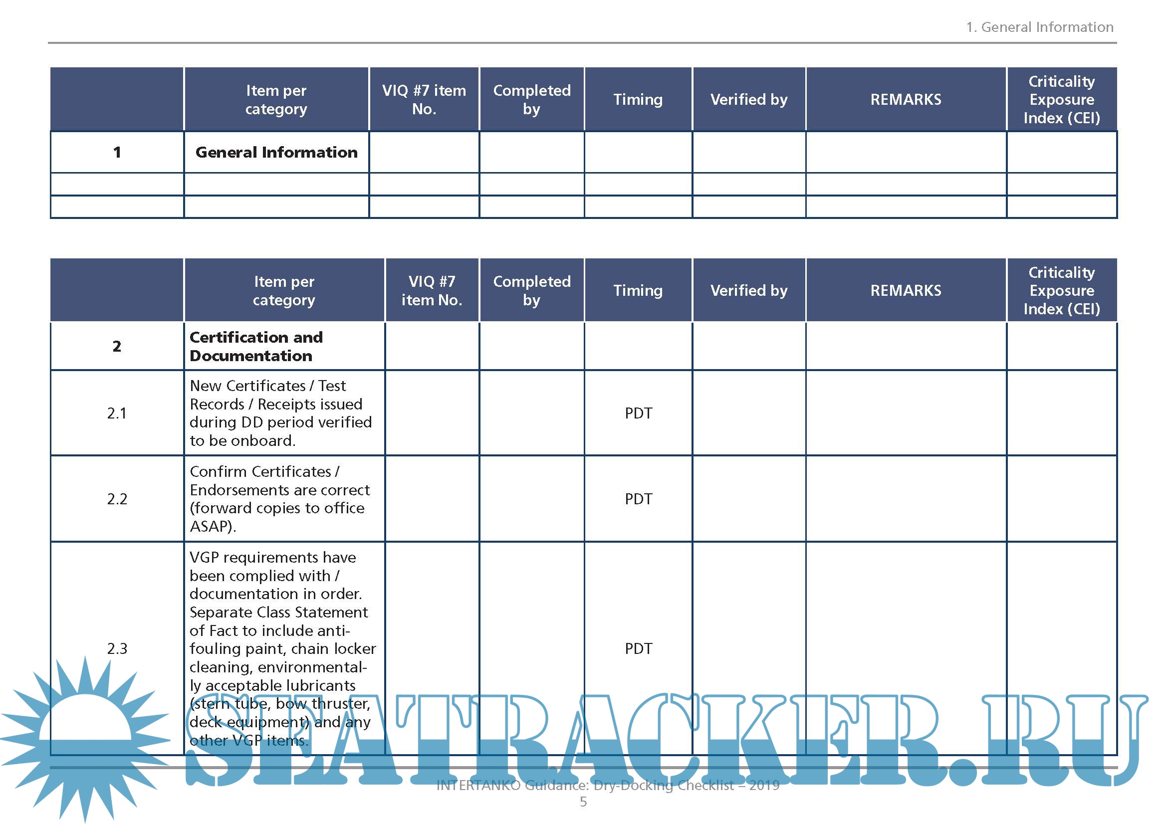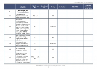 Additional info: The Dry-Dock Checklist is generic and can be used by INTERTANKO Members as they see appropriate. This Dry-Dock Checklist should be seen as a dynamic document, open to regular improvements as suggested by Members. There are some items that feature in more than one category, and with Members’ further screening and practice, one could hopefully agree to which category each item should be assigned.