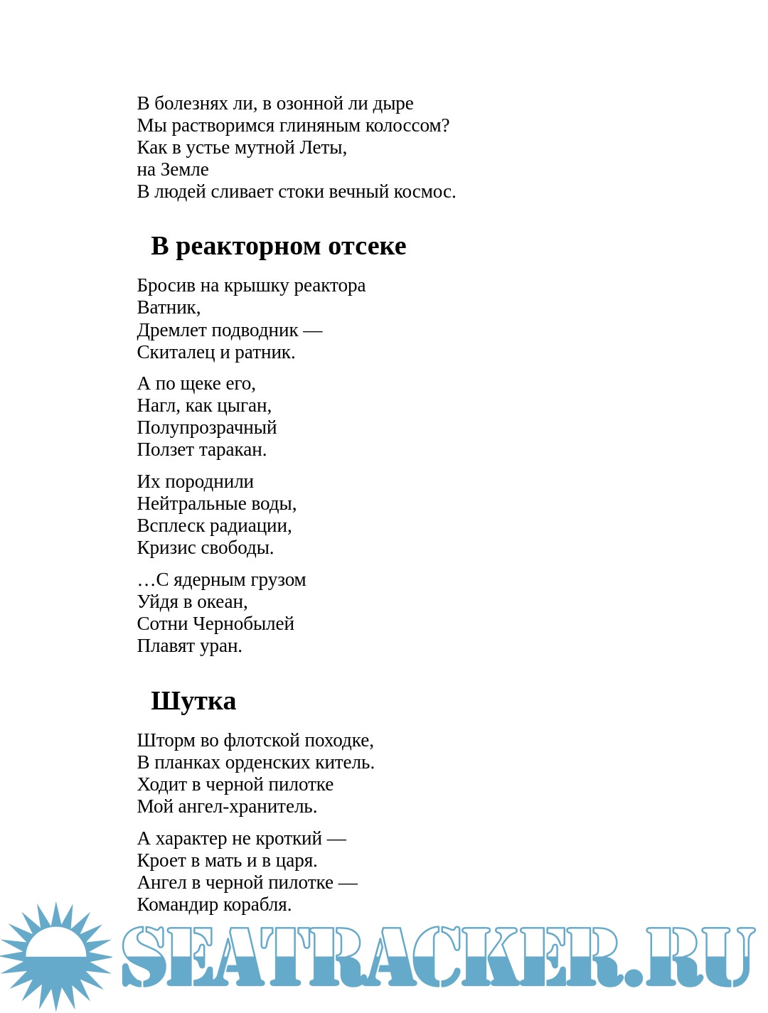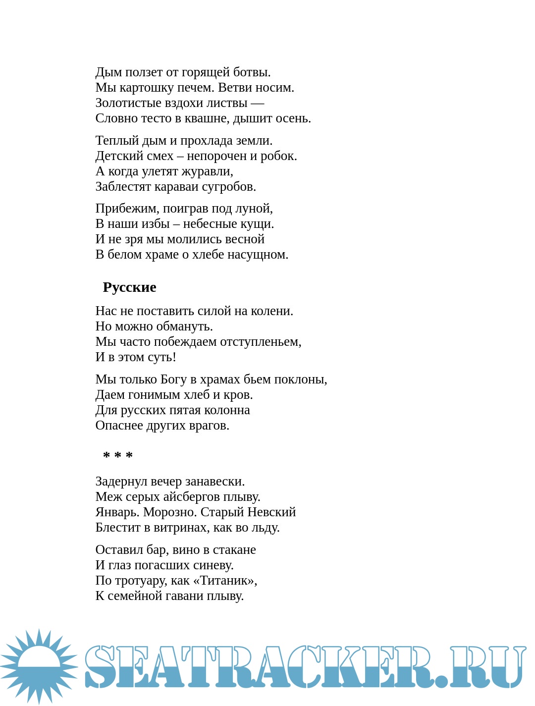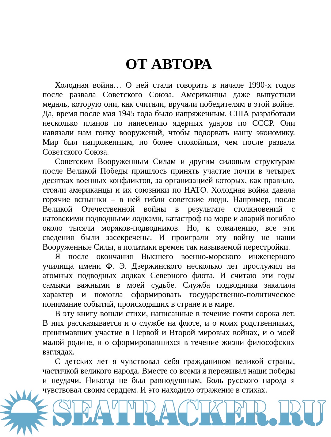 Описание: В эту книгу вошли стихи, написанные в течение почти сорока лет. В них рассказывается о службе на флоте, о родственниках принимавших участие в Первой и Второй мировых войнах, о малой родине автора и о сформировавшихся в течение жизни философских взглядах. С детских лет Борис Александрович Орлов чувствовал себя гражданином великой страны, частичкой великого народа. Вместе со всеми он переживал наши победы и неудачи. Никогда не был равнодушным. Боль русского народа чувствовал своим сердцем. И это нашло отражение в его стихах: «Русский мир – это мир, в котором я родился, мир, который я защищал, служа на флоте, и продолжаю защищать, служа литературе. Меня радует, что Россия в последние годы значительно окрепла, вернула Крым, ее корабли опять бороздят океаны. Я верю в счастливое будущее моей страны, страны сильной и справедливой, хотя и придется ей пройти еще через множество нелегких испытаний».