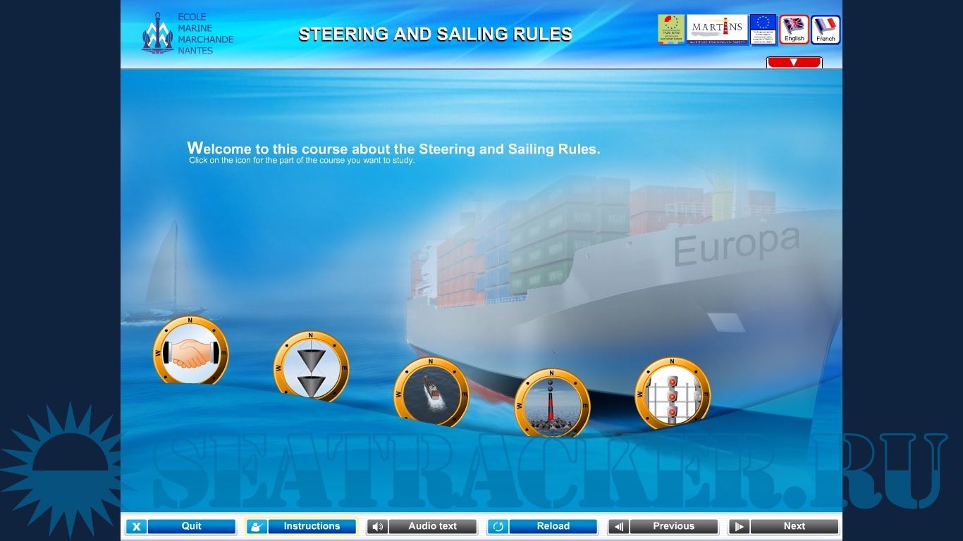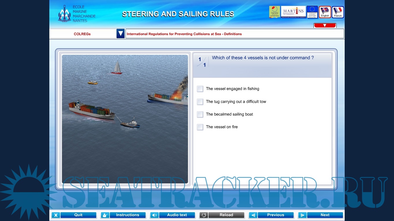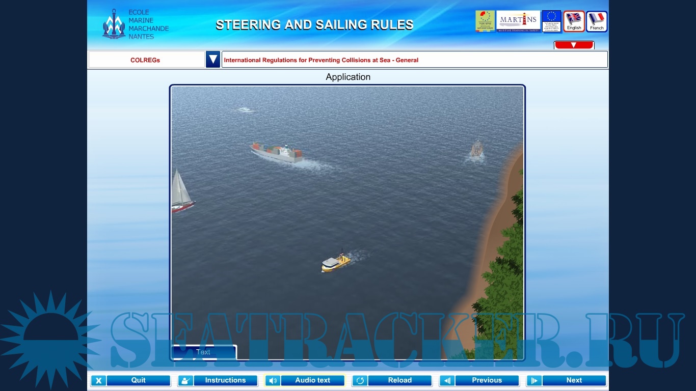 Year: 2008 Developer: MARTINS Platform: Windows Localization: english Crack: Not needed Description: This is a training program for learning of : COLREGs,Port traffic signals,IALA buoyage system and International visual storm warning signals. In COLREGs section you can find all rules represented in well made animations,sounds and description. In the end of each rule u have to answer a few questions.