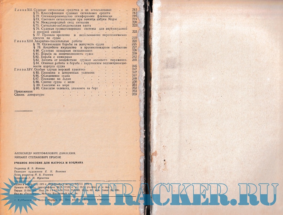 Год выпуска: 1975 Язык: Русский Автор: Дамаскин А. М., Крысак М. С. Жанр: Учебное пособие , Морское дело Издательство: Транспорт (Москва) Издание: 1 Формат: PDF Качество: Отсканированные страницы + OCR с ошибками Количество страниц: 139 Описание: «Учебное пособие для матроса и боцмана», изданное в 1975 году издательством «Транспорт», представляет собой фундаментальный практико-ориентированный труд, предназначенный для подготовки рядового палубного состава морских судов. Книга охватывает полный круг обязанностей матроса и боцмана в процессе технической эксплуатации транспортного судна. В пособии подробно рассматриваются вопросы морской практики, такелажного и якорного снабжения, швартовных и грузовых операций, ухода за судном, выполнения малярных работ, эксплуатации рулевого и буксирного устройств. Значительное внимание уделено спасательным и сигнальным средствам, организации аварийно-спасательных работ, борьбе за живучесть судна, противопожарной защите и технике безопасности. Отдельные главы посвящены особым условиям плавания — штормам, обледенению, льдам, посадке на мель и спасанию людей на море. Материал изложен системно, сопровождается иллюстрациями и нормативными требованиями. Пособие предназначено для учащихся мореходных школ, профессионально-технических училищ и учебно-курсовых комбинатов, а также представляет практическую ценность для действующих матросов и боцманов морского флота. Доп. информация: Нашел на чердаке, решил отсканировать и поделиться с вами, может кому будет полезно. К сожалению несколько листов были погрызаны мышами, но не критично. Разрешение скана 300dpi, обрезаны поля, выровнены листы, наложен OCR с ошибками