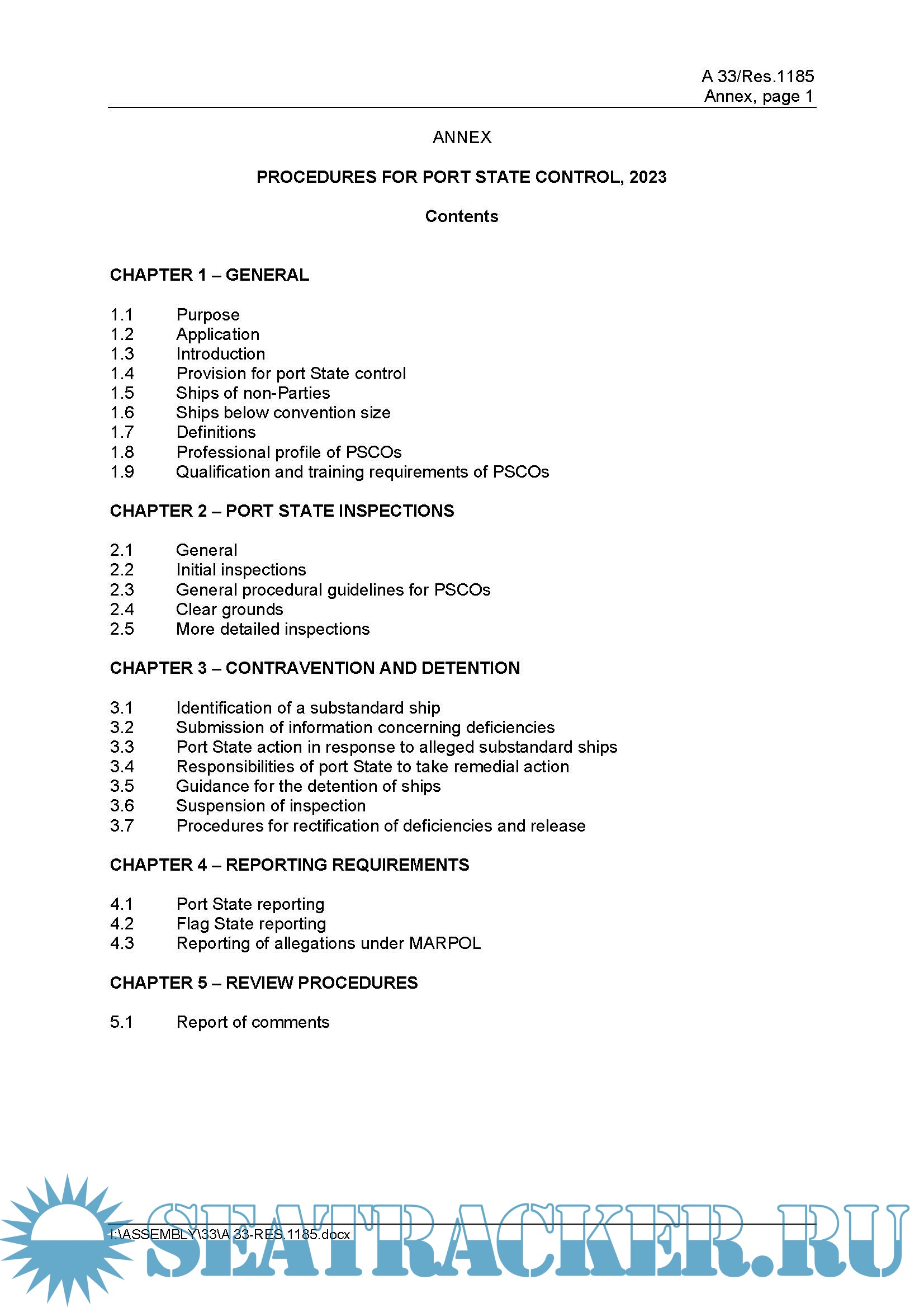 The International Maritime Organization (IMO) has always acknowledged that effective implementation and enforcement of the global maritime standards contained in its conventions are primarily the responsibility of the flag State to which a ship's flag is flying. Nevertheless, the Organization has also recognized that the exercise of the right to carry out port State control, as provided for in relevant international conventions, contributes to ensuring that global maritime standards are being implemented consistently on all ships. Port State control involves the inspection of foreign ships in national port areas to verify that the condition and operation of a ship and its equipment comply with the relevant requirements contained in the applicable mandatory international instruments to which the port State is a Party.The Organization cooperates with port State control regimes within the framework of resolution A.682(17) on Regional cooperation in the control of ships and discharges to support the harmonization of port State control activities. In this context, the IMO Sub-Committee on Implementation of IMO Instruments (III) recognizing the need for a single comprehensive, consolidated and updated instrument to facilitate the work of maritime administrations in general, and port State control officers (PSCOs) in particular ? reviewed and amalgamated existing resolutions and documents on port State control. This resulted in the adoption of resolution A.1185(33) by the IMO Assembly, on 6 December 2023, which contains, as an annex, the Procedures for port State control, 2023 following successive revocation of resolutions A.1155(32), A.1138(31), A.1119(30), A.1052(27), A.882(21), A.787(19), A.742(18), A.597(15) and A.466(XII). The Assembly requested the Maritime Safety Committee and the Marine Environment Protection Committee to keep the Procedures under review and to amend them as necessary.