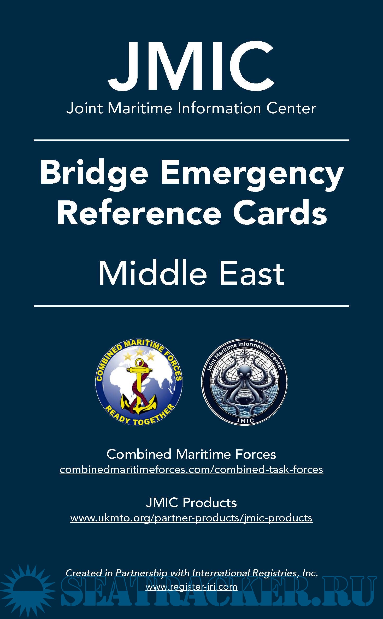 Description: The Joint Maritime Information Center has released an updated set of quick reference 'bridge cards’ for the Middle East region. The cards cover a wide range of potential security events in this region and can help masters and crews prepare for and respond to incidents.
