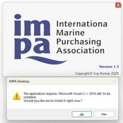 Year: 2025 Version: 1.3 Developer: Yury Komar Telegram Platform: Windows System Requirements: - Windows 7/8/10/11 - .NET Framework 4.8 - MS Visual C++2010 Localization: English Crack: Not needed Description: An offline version of IMPA Catalogue for Windows. Portable, lightweight and fast. Search engine trying to find your portion of text in catalogue by codes, names and descriptions in seconds, very fast, so that you are not required to waste long time while searching something for your marine orders using hard-copy paper books of the same catalogue on board. Papers are in the past.!!! • Import of Cart from CSV • Add User Comments for items you adding to the Cart • Ability to edit your comment right in the Cart's table • Cross-platform! Now you can export/import your cart to CSV and continue editing on any Android(by Mikhail Mishabar)/Windows(by Yury Komar) device! Additional info: Try IMPA Finder (By Mikhail Mishabar)(for Android):https://www.rustore.ru/catalog/...ud.impacatalogue Please support the project:http://sea-soft.ru/donate.html If any application from Sea-Soft Project has helped you with routine job or simplifying any other tasks, consider supporting its continued development with a small donation! ???? Application requires VC++ 2010 version. Included in the torrent. Can be also download from here https://t.me/SeaSoft_by_YuryKomar/3856/3947 Any donations large or small are greatly appreciated :) Donate : EUR via Telegram Any via Boosty RUB via Sber Made with ❤ in Vladivostok.