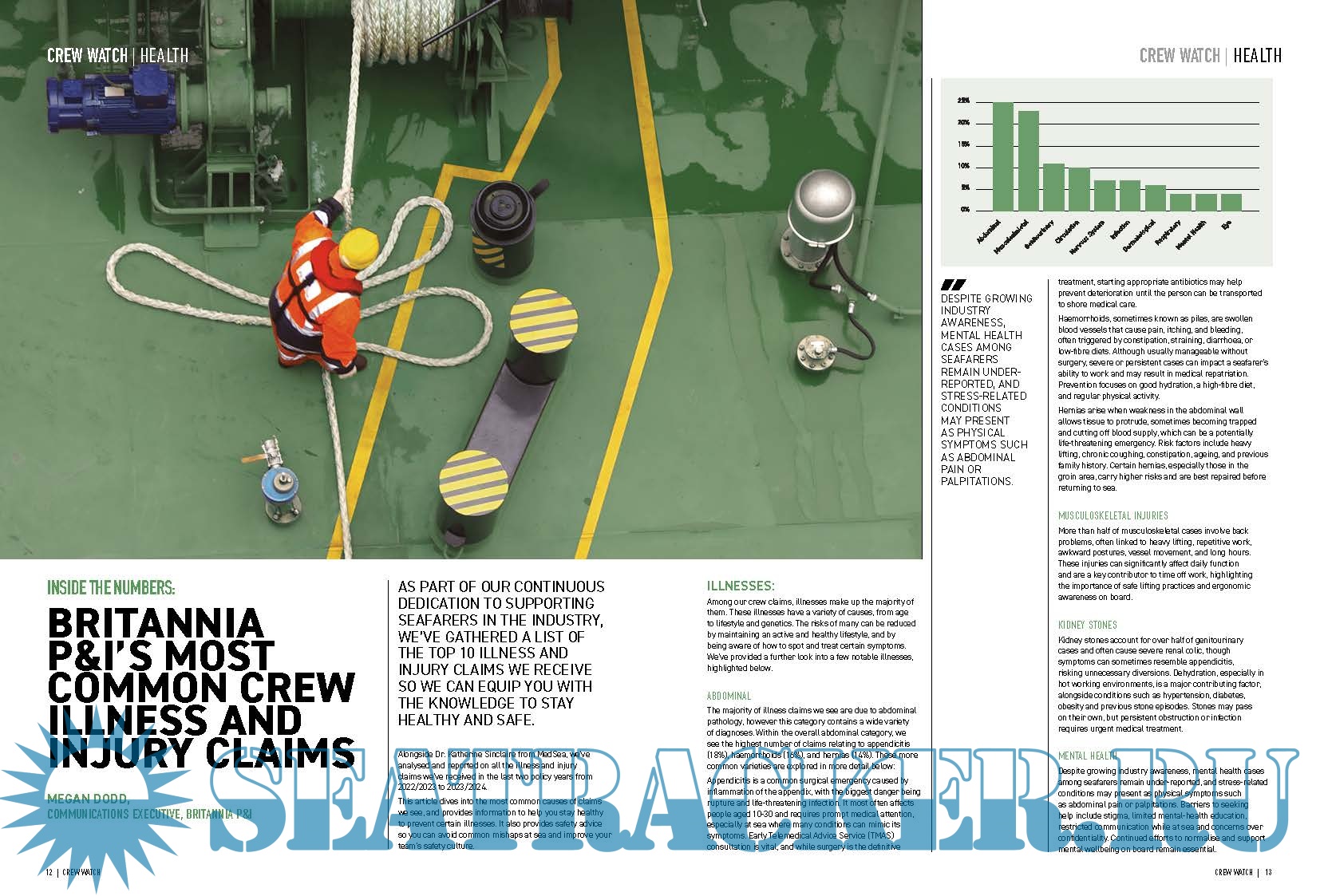 Year: 2025 Language: English Author: Britannia P&I Club Genre: Magazine Publisher: Britannia P&I Club Edition: December 2025 Format: PDF Quality: eBook Pages count: 16 Description: The publication of Crew Watch is aimed directly at Members’ crew with practical advice of topical Safety, Health and Welfare issue. For the final edition of Crew Watch this year, we focus on the importance of health and safety while at sea. From insights into keeping your eyes protected, safety advice during winter months, to advice on the safe handling of heavy steel plates. This edition features an exclusive poster from our BSafe campaign, encouraging you to always think about eye safety. You can tear out the poster to display on board.