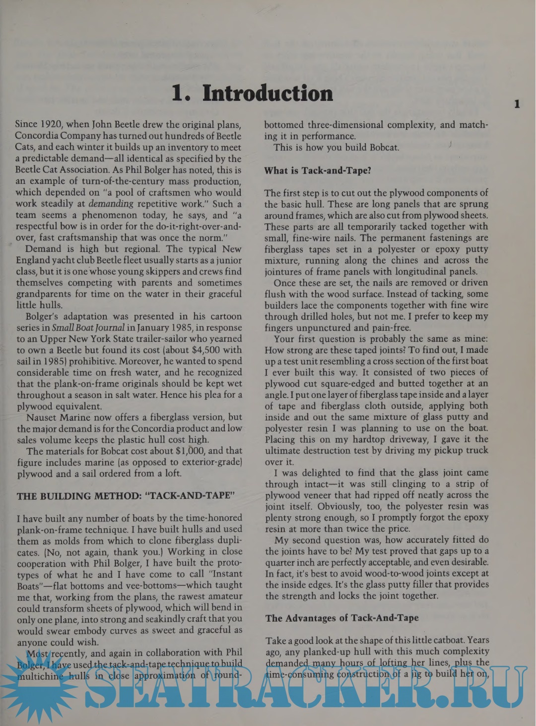 Year: 1986 Language: English Author: Harold Payson Genre: Instruments, Boatbuilding, Woodworking Publisher: International Marine Publishing Company Camden, Maine 04843 ISBN: 0-87742-222-2 Format: PDF Quality: Scanned pages + text layer Pages count: 52 Description: Sorpe years ago, downeast boatbuilder Harcfld H. Payson — known to associates, friends, and his wife as Dynamite — and Philip Bolger of Gloucester, Massachusetts — arguably the most innovative small-craft designer around — got their heads together and came up with a new and startling idea: Instant Boats. Bolger began designing a series of bdats that would require no lofting, no jigs, and no exotic tools, skills, or materials. Boats that would not require a great investment of time to cut out and button up. In short, boats for the inexperienced builder whose fundamental desire is to get out on the water. Payson, for his part, builds and thoroughly tests a prototype of each design to wring out every' bug before offering the plans for sale. The original fleet of six boats was described in Dynamite’s book Instant Boats. Thete followed Build the New Instant Boats, presenting eleven more designs, including three shapely and spritely “tack-and-tape” boats. The verdict is in: thousands of amateur builders, have found that the Instant Boats make enjoyable and manageable backyard or basement projects and offer just about the least expensive boating available anywhere. You need not be driven by lack of tools, materials, skills, or time to abandon in frustration a project you conceived in a spirit of pleasurable anticipation. Here is the Instant Catboat. Her easy grace and spirited performance belie her humble components. She is at home in fresh water or salt. Dynamite prefers she be built of marine plywood (sources for which are given), though exterior-grade is acceptable. With marine ply and a loft-made sail, her materials will cost about $1,000. Given her looks and performance, a better bargain is hard to imagine. She is more complex than the other Instant Boats, but nevertheless far simpler to build than most other boats her size. The set of large-scale plans that Dynamite sells mailorder for $35.00 can save eyestrain and time, but she can be built right from this book. Either way, your efforts will be amply rewarded.