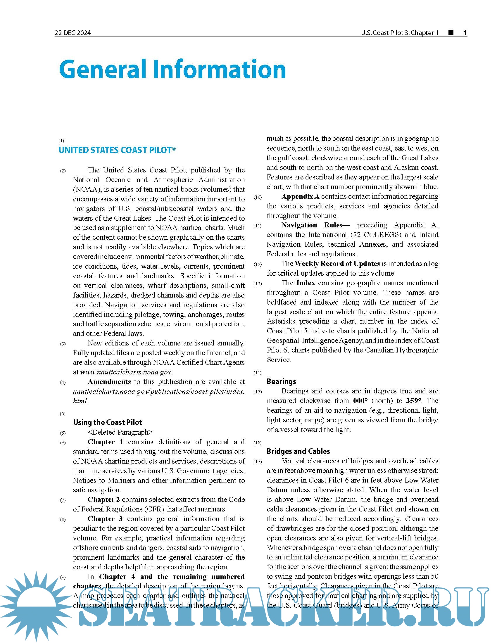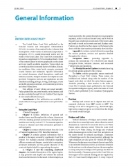 Topics in the Coast Pilot include channel descriptions, anchorages, bridge and cable clearances, currents, tide and water levels, prominent features, pilotage, towage, weather, ice conditions, wharf descriptions, dangers, routes, traffic separation schemes, small craft facilities, and Federal regulations applicable to navigation.