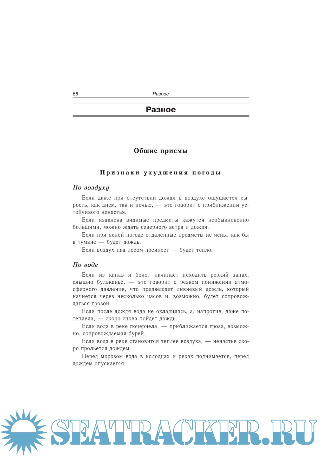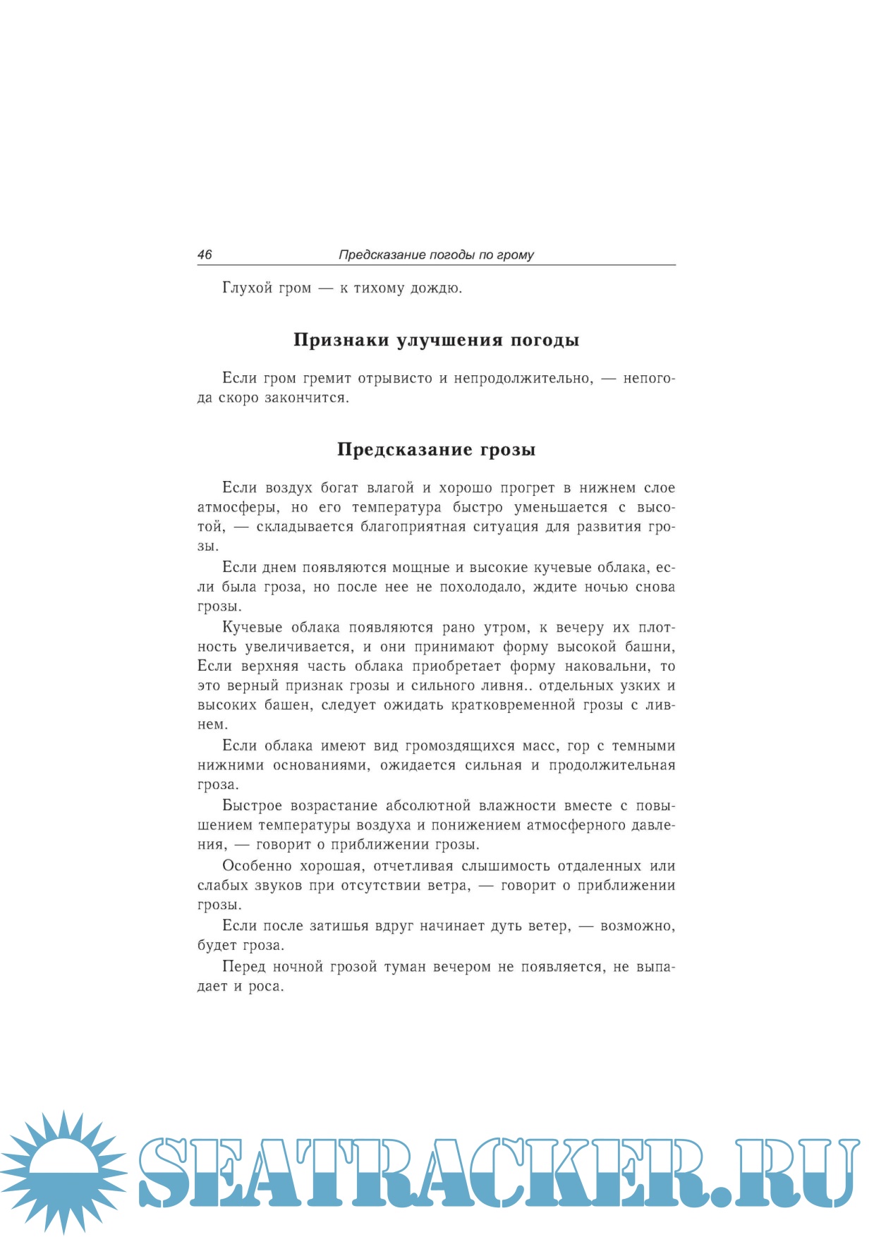 СОДЕРЖАНИЕ Введение 3 Прогнозирование погоды по ветру 4 Признаки ухудшения погоды 4 Признаки улучшения погоды 7 Признаки сохранения хорошей погоды 8 Прогнозирование приближения ветра 9 Признаки тихой погоды 10 Предсказание погоды по облакам 11 Признаки ухудшения погоды 11 Признаки улучшения погоды 20 Признаки сохранения хорошей погоды 21 Предсказание погоды по дождю 22 Признаки ухудшения погоды 22 Признаки улучшения погоды 22 Предсказание погоды по снегу 23 Признаки ухудшения погоды 23 Предсказание погоды по росе 24 Признаки ухудшения погоды 24 Признаки улучшения погоды 25 Признаки сохранения хорошей погоды 25 Предсказание погоды по инею 26 Признаки ухудшения погоды 26 Признаки сохранения хорошей погоды 26 Предсказание погоды по туману 28 Признаки ухудшения погоды 28 Признаки улучшения погоды 29 Признаки сохранения хорошей погоды 29 Прогнозирование приближения тумана 29 Предсказание погоды по небу 30 Признаки ухудшения погоды 30 Признаки улучшения погоды 31 Признаки сохранения хорошей погоды 32 Предсказание погоды по солнцу 33 Признаки ухудшения погоды 33 Признаки улучшения погоды 35 Признаки сохранения хорошей погоды 36 Предсказание погоды по звездам 37 Признаки ухудшения погоды 37 Признаки улучшения погоды 38 Признаки сохранения хорошей погоды 38 Предсказание погоды по луне 39 Признаки ухудшения погоды 39 Признаки улучшения погоды 40 Признаки сохранения хорошей погоды 40 Предсказание погоды по дыму 41 Признаки ухудшения погоды 41 Признаки улучшения погоды 42 Признаки сохранения хорошей погоды 42 Предсказание погоды по радуге 43 Признаки ухудшения погоды 43 Признаки улучшения погоды 44 Предсказание погоды по грому 45 Признаки ухудшения погоды 45 Признаки улучшения погоды 46 Предсказание грозы 46 Предсказание погоды по граду 48 Предсказание града 48 Предсказание погоды по температуре 49 Признаки ухудшения погоды 49 Признаки улучшения погоды 50 Признаки сохранения хорошей погоды 50 Предсказание жары 51 Предсказание теплой, но не жаркой погоды 51 Предсказание оттепели 51 Прогнозирование морозов 53 Предсказание заморозков 55 Предсказание устойчивой снежной погоды без больших морозов 56 Предсказание погоды по давлению 57 Признаки ухудшения погоды 57 Признаки улучшения погоды 58 Признаки сохранения хорошей погоды 58 Предсказание погоды в горах 59 Признаки ухудшения погоды 59 Признаки улучшения погоды 60 Признаки сохранения хорошей погоды 60 Предсказание погоды по морю 61 Признаки ухудшения погоды 61 Признаки улучшения погоды 63 Признаки сохранения хорошей погоды 64 Разное 66 Общие приемы 66 Рыбацкие приметы 68 Туристические приметы 69 Предсказание погоды по растениям 70 Признаки ухудшения погоды 70 Признаки улучшения погоды 76 Признаки сохранения хорошей погоды 77 Живые часы 78 Предсказание погоды по насекомым 79 Признаки ухудшения погоды 79 Признаки улучшения погоды 81 Признаки сохранения хорошей погоды 82 Предсказание погоды по земноводным 84 Признаки ухудшения погоды 84 Признаки улучшения погоды 85 Предсказание погоды по рыбам 86 Признаки ухудшения погоды 86 Признаки сохранения хорошей погоды 87 Предсказание погоды по птицам 88 Признаки ухудшения погоды 88 Признаки улучшения погоды 92 Признаки сохранения хорошей погоды 93 Предсказание погоды по животным 96 Признаки ухудшения погоды 96 Признаки улучшения погоды 99 Признаки сохранения ясной погоды без осадков 100 Перемена погоды к