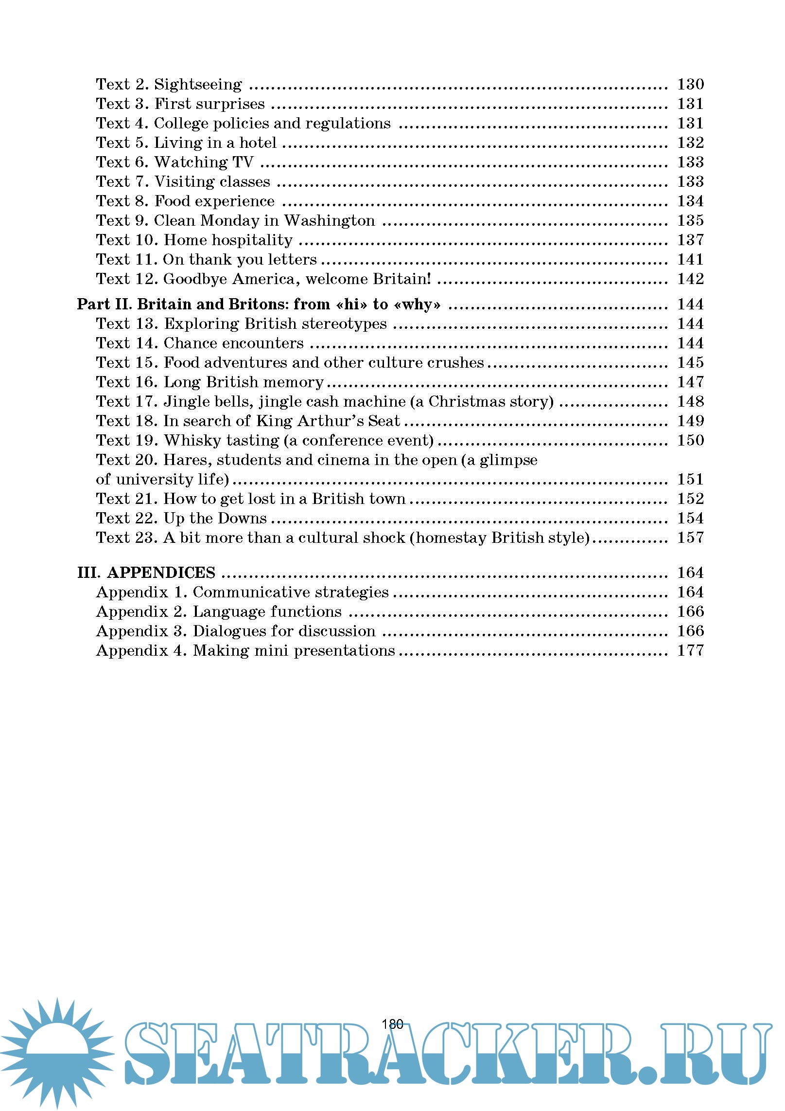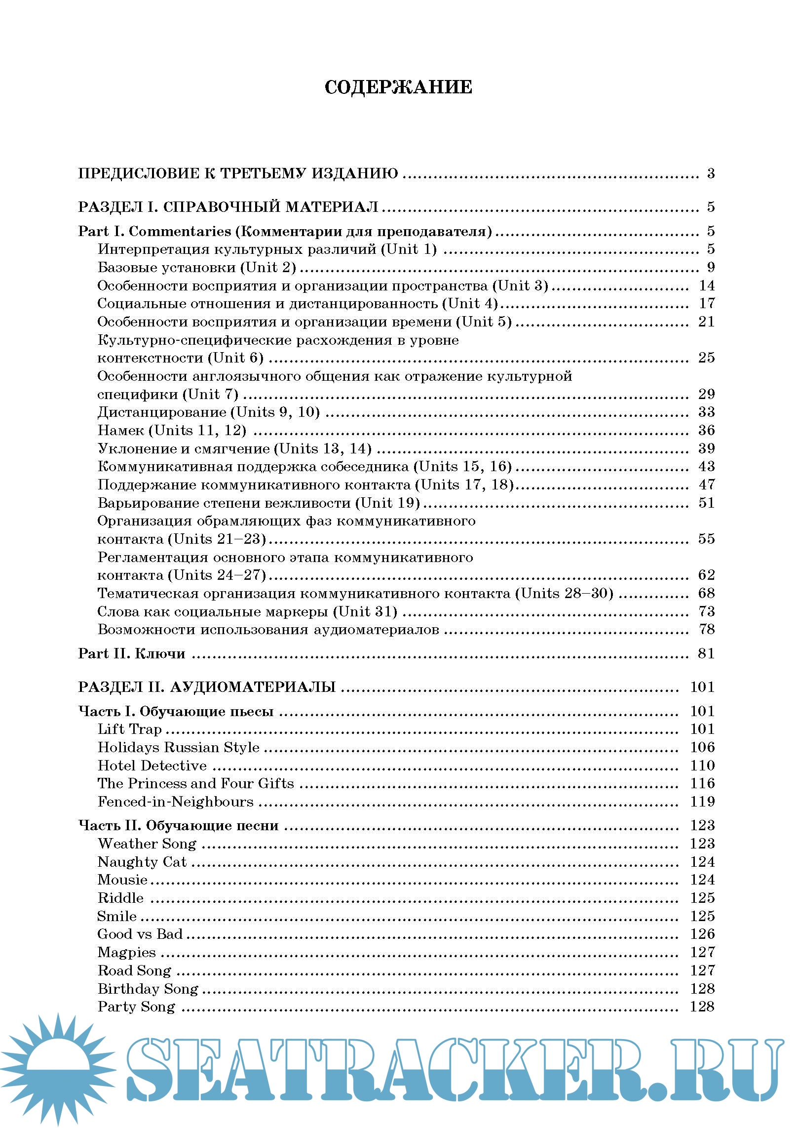 Книга для преподавателя является дополнением к представленному в учебнике базовому курсу и содержит обширный справочный материал с подробными поурочными комментариями и анализом типичных ошибок, возникающих при общении россиян с англоговорящими партнерами в различных речевых ситуациях, а также возможные варианты выполнения заданий и тестов. Новаторским элементом является подборка аудиоматериалов, включающая авторские обучающие пьесы и песни межкультурной тематики, которые можно использовать как для аудиторной, так и для проектной работы.