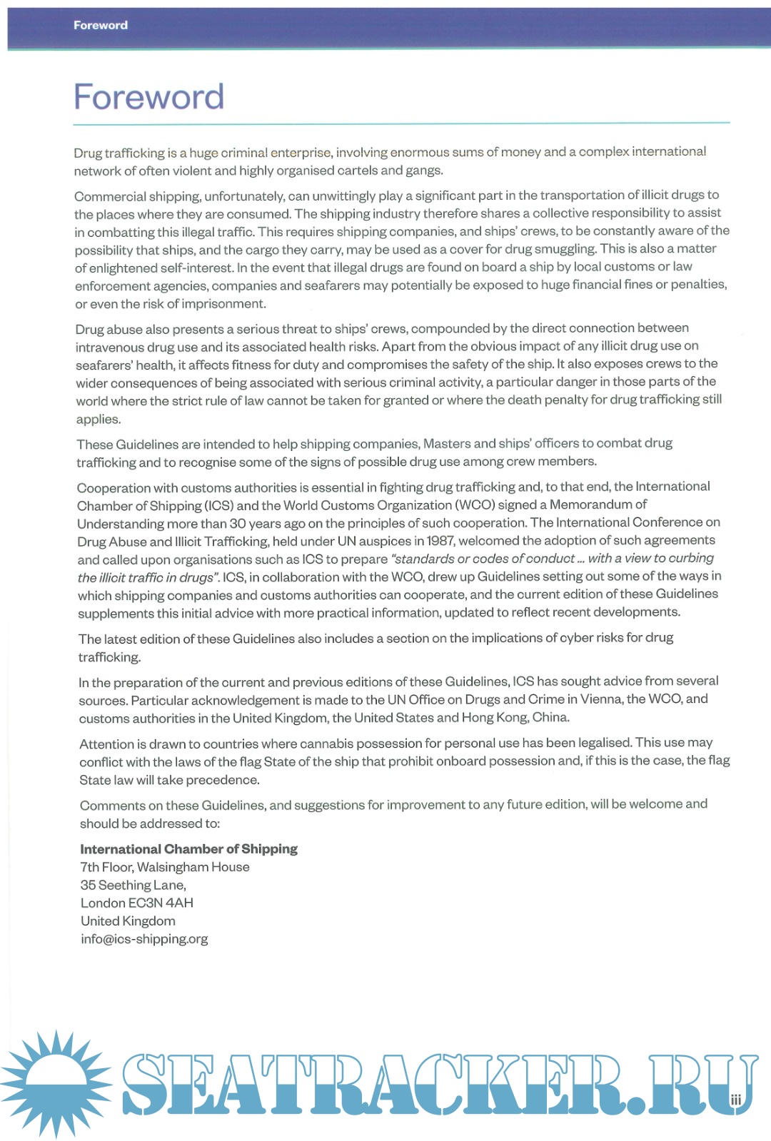 These Guidelines are intended to help shipping companies, Masters and ships' officers to combat drug trafficking and to recognise some of the signs of possible drug use among crew members. Cooperation with customs authorities is essential in fighting drug trafficking and, to that end, the International Chamber of Shipping (ICS) and the World Customs Organization (WCO) signed a Memorandum of Understanding more than 30 years ago on the principles of such cooperation. The International Conference on Drug Abuse and Illicit Trafficking, held under UN auspices in 1987, welcomed the adoption of such agreements and called upon organisations such as ICS to prepare "standards or codes of conduct ... with a view to curbing the illicit traffic in drugs". ICS, in collaboration with the WCO, drew up Guidelines setting out some of the ways in which shipping companies and customs authorities can cooperate, and the current edition of these Guidelines supplements this initial advice with more practical information, updated to reflect recent developments.