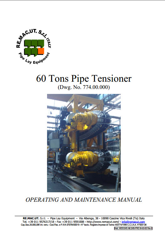 Description: This machine has been designed and developed to help the laying of pipes in the sea; it is called the Pipe Tensioner. The main function of this machine isto apply to the pipes a maximum tension load of 60 tons at a maximum laying speed of 40 m/min.