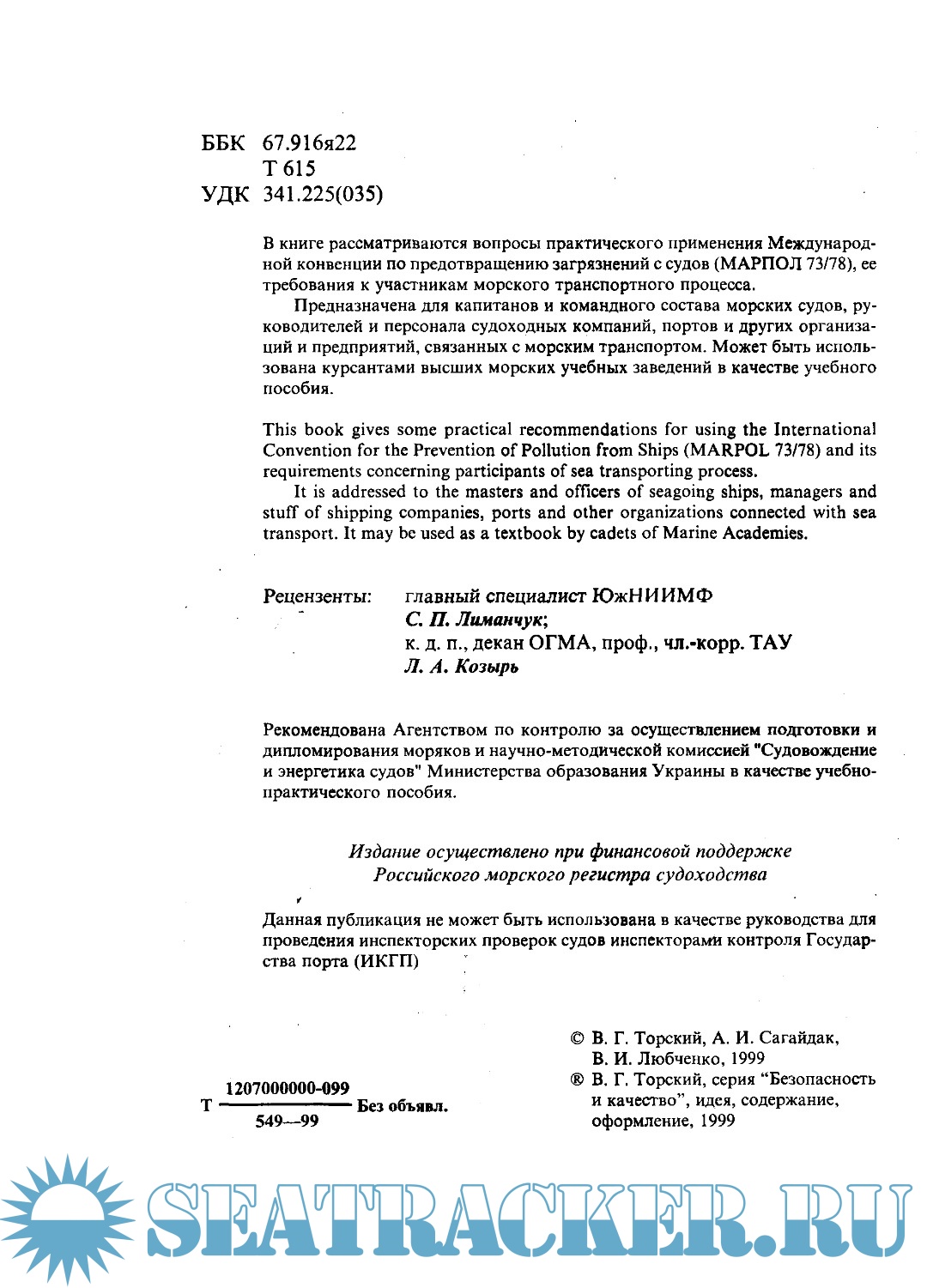 Описание: В книге рассматриваются вопросы практического применения Международной конвенции по предотвращению загрязнений с судов (МАРПОЛ 73/78), ее требования к участникам морского транспортного процесса.