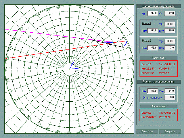 * Автоматическое построение треугольников относительного движения для любой цели в любой момент времени.