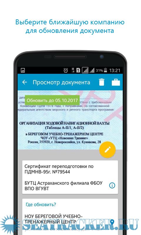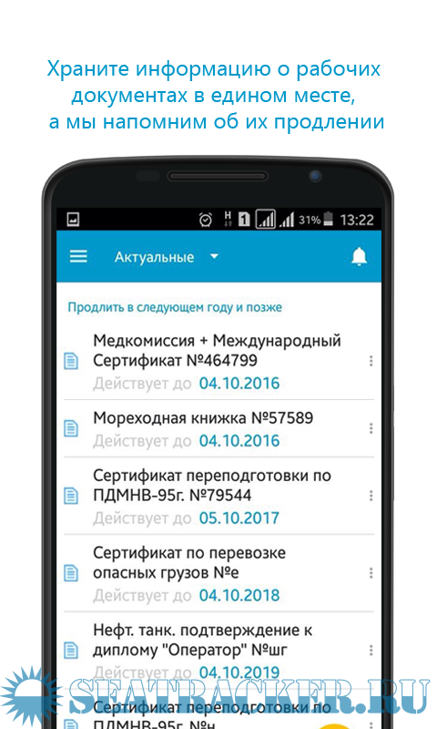Пардон, но хрень какая-то. Доки меняются раз в 5 лет, в России по крайне мере. А тут в программе надоедающая реклама + вносить свои данные + данные по осадкам судна (???). Что за сборная солянка? И для чего она? Рабочий диплом определяет все даты, т.к. выдается по самый ранее заканчивающийся документ. Диплом заканчивается - пришел в контору капитана порта и там все есть по замене документов: адреса сертифицированных учебных заведений и что какие корочки или фантики они дают. И все это один раз в 5 лет. Лучше бы данные по публичным домам внесли (вместе с расценками на услуги) - и то было бы больше пользы и приятности. Весьма бесполезное приложение для Андроида, точнее для моряков, пользующихся андроидом.