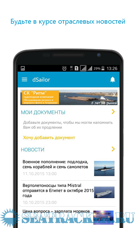 Год выпуска: 2015 Версия: 2.1 Разработчик: dSailor Платформа: Android Системные требования: Android 4.0 + Язык интерфейса: только русский Описание: Моряки, мы ждем Вас в свою команду! Уверены, Вы оцените по достоинству это обновление! Мы стараемся создать продукт, который будет соответствовать новейшим мобильным технологиям и потребностям членов экипажей морских и речных судов, и специалистов портовых служб! Наша цель - создать единую и максимально удобную рабочую область для моряка! Всех, кто готов принять участие в улучшении мобильного приложения dSailor, мы готовы выслушать посредством отзывов и комментариев в Google Play или отправив отзыв через мобильное приложение: Настройки - Обратная связь.-Преимущества: