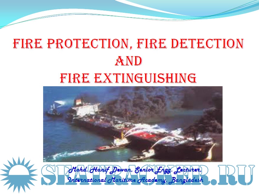 Year: 2014 Language: english Author: Mohd. Hanif Dewan, Senior Engg. Lecturer Genre: Presentation Publisher: International Maritime Academy, Bangladesh Format: PDF Quality: eBook Pages count: 292 Description: As of new definitions of IMO, May 2007, there are 6 types of fire onboard ships: Class A: Fires that involve flammable solids such as wood, cloth,paper and some plastics. Class B: Fires that involve flammable liquids or liquifiable solids such as petrol, oil, paint and some waxes and plastics (BUT NOT cooking fats or oils). Class C: Fires that involve flammable gases such as methane propane hydrogen Mohd. Class D: Fires that involve combustible metals such as sodium, magnesium, and potassium. Class E: Fires that involve any of the materials found in Class A and B fires: BUT ALSO with the introduction of an electrical appliances, wiring, or other electrically energized objects in the vicinity of the fire, with a resultant electrical shock risk if a conductivity agent is used to control the fire. Class F: Fires involving cooking fats and oils. The high temperature of the oils when on fire far exceeds that of other flammable liquids making normal extinguishing agents ineffective