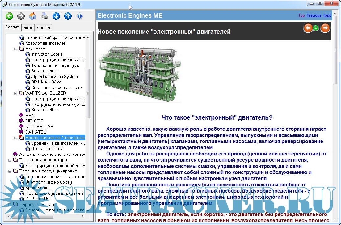 В Справочник включены прикладные программы в помощь повседневной работе механиков, описание и принцип действия вспомогательных систем, их обслуживание и характерные неисправности, видеоматериалы по обслуживанию главного двигателя, каталоги двигателей и оборудования, полезные ссылки Интернета, словари, английские наименования инструментов, приемы устранения неисправностей компьютера.