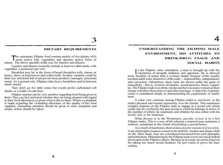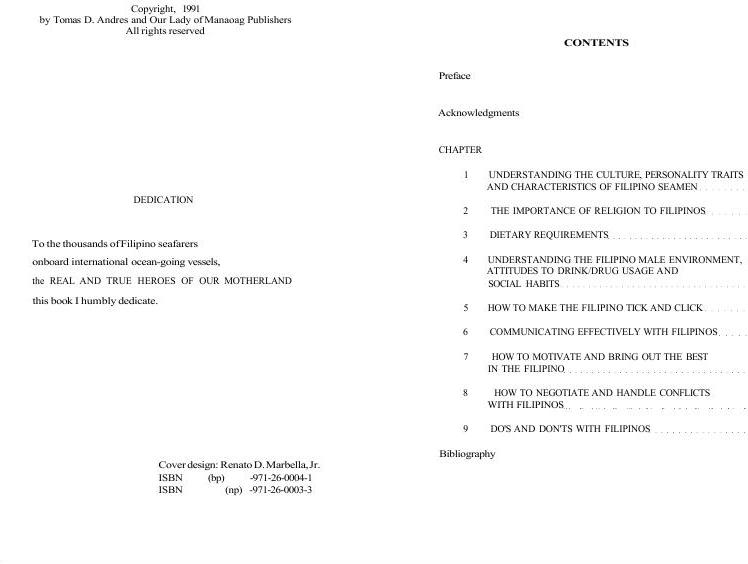 CONTENTS Preface Acknowledgments CHAPTER 1 UNDERSTANDING THE CULTURE, PERSONALITY TRAITS AND CHARACTERISTICS OF FILIPINO SEAMEN 2 THE IMPORTANCE OF RELIGION TO FILIPINOS 3 DIETARY REQUIREMENTS 4 UNDERSTANDING THE FILIPINO MALE ENVIRONMENT, ATTITUDES TO DRINK/DRUG USAGE AND SOCIAL HABITS 5 HOW TO MAKE THE FILIPINO TICK AND CLICK 6 COMMUNICATING EFFECTIVELY WITH FILIPINOS 7 HOW TO MOTIVATE AND BRING OUT THE BEST IN THE FILIPINO 8 HOW TO NEGOTIATE AND HANDLE CONFLICTS WITH FILIPINOS 9 DO'S AND DON'TS WITH FILIPINOS Bibliography