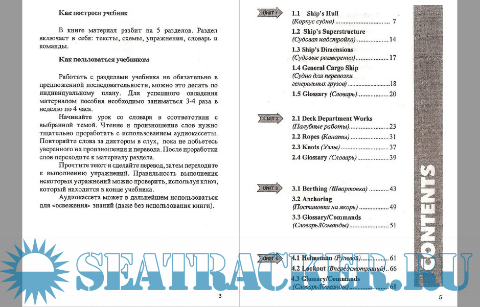 Основная цель настоящего учебника - овладение профессиональной лексикой и командами, которые охватывают такие темы: устройство судна; палубные работы и инструменты; канаты и узлы; постановка на якорь; швартовка; несение вахты; команды рулевому; прием лоцмана; буксировка; предупреждение загрязнения окружающей среды.