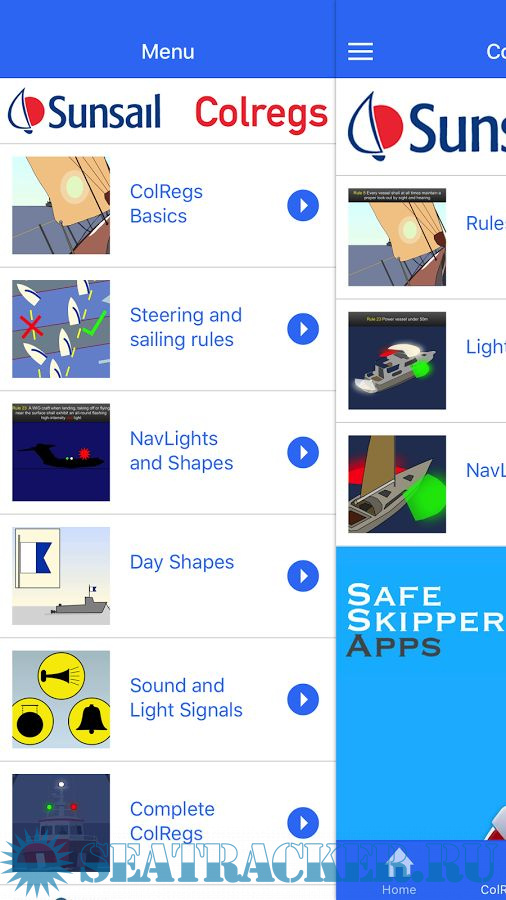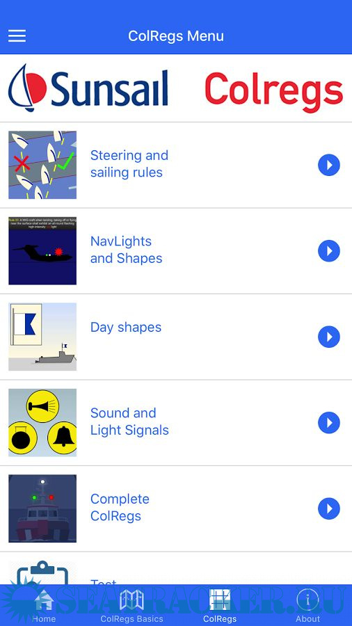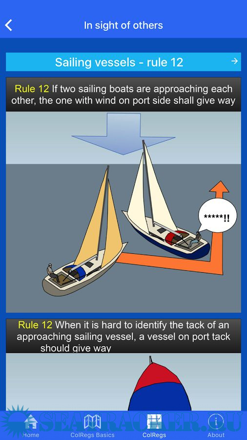 SUNSAIL SAILING SCHOOL provides at-a-glance information to help all boaters learn how to identify other vessels and the activities they are engaged in, day or night. The app clarifies which vessels have priority, with explanatory graphics and captions, in addition to the complete rules.