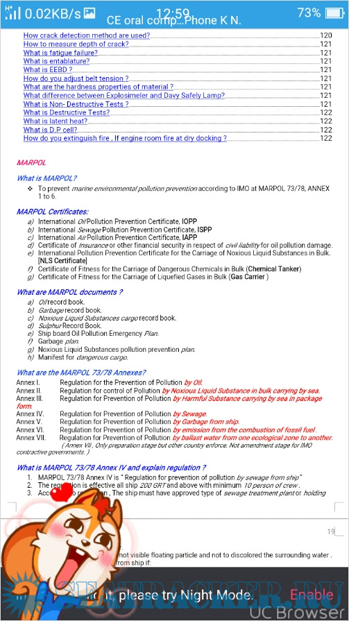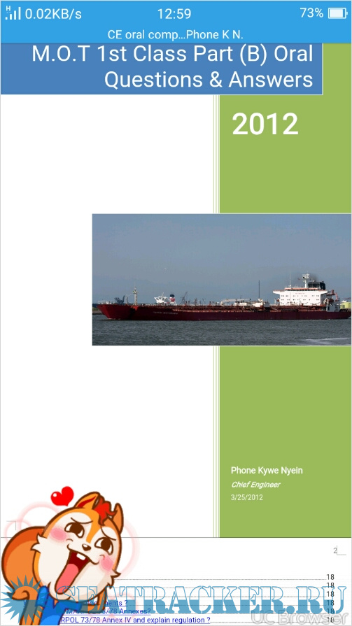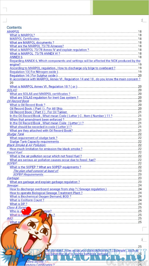 Contents MARPOL 18 What is MARPOL? 18 MARPOL Certificates: 18 What are MARPOL documents ? 18 What are the MARPOL 73/78 Annexes? 18 What is MARPOL 73/78 Annex IV and explain regulation ? 18 What is MARPOL 73/78 ANNEX VI ? 18 ANNEX 6 18 Regarding ANNEX 6, Which components and settings will be affected the NOX produced by the engine? 19 According to MARPOL regulation , How to discharge oily bilge to overboard ? 19 Regulation 13( For Nitrogen oxide ) 19 Regulation 14 ( For Sulphur oxide ) 20 In accordance with MARPOL Annex VI , Regulation 14 and 18 , do you know the main concern ? 20 What is MARPOL Annex VI , Regulation 18 ? ( or ) 20 SOLAS: 20 What are SOLAS and MARPOL certificates ? 20 What are SOLAS regulation for Inert Gas system ? 20 Oil Record Book 20 What is Oil Record Book ? 20 Oil Record Book: ( Part I ) , For All Ship. 20 Oil Record Book: ( Part II ) , For Oil Tanker. 21 In the Oil Record Book , What mean Code ( Letter ) C , Item ( Number ) 11 ? 21 When that amendment been enforced ? 21 In the Oil Record Book , What mean Code ( Letter ) I ? 21 What should be recorded in code ( Letter ) I ? 21 What are they attached with Oil Record Book? 21 Sludge Tank 22 What requirement of sludge tank ? 22 Sludge Tank Capacity requirements 22 Black Smoke & Air Pollution: 22 How much limitation for emission the black smoke ? 22 Fossil Fuel: 22 What is the air pollution occur which not fossil fuel ? 22 What are serious air pollution causes occur due to fossil fuel? 22 SOPEP: 22 What is the SOPEP ? What are SOPEP equipments ? 22 The plan shall consist at least of: 23 SOPEP Requirements: 23 Garbage: 23 What are garbage and explain garbage regulation ? 23 Sewage: 24 How to discharge overboard sewage from ship ? ( Sewage regulation ) 24 How to operate Biological Sewage Treatment Plant ? 24 What is Biochemical Oxygen Demand, BOD ? 24 What is Coliform Count ? 24 What is DP ? 24 Class & Survey 25 Who is underwritten surveyor? 25 What is classification societies ? 25 IMO: 25 What are IMO conventions ? 25 I.S.M 25 As per your company’s I.S.M standard , How would you done deficiency ? ( Example : such as starting failure of emergency generator due to starter batteries damage ) 25 Statutory: 25 What is Statutory Survey ? 25 What are Statutory Certificates ? 25 Classification: 26 What is classification Survey ? 26 Why Classification Societies sometimes issue the Statutory Certificate? 26 Difference between : Statutory Survey and Classification Survey: 26 Documents: 26 Documents on board: 26 Survey Type: 27 What are periodical survey ( or ) Annual , Intermediate and Special survey ? 27 Periodical Survey: 27 Annual Survey (machinery): 27 Intermediate Survey (machinery): 27 Special Surveys (machinery): 27 Tail Shaft Survey: 27 Explain tail shaft survey ? 27 Tail shaft survey include 27 How to with draw tail shaft ? 28 Flaf State & Port State: 28 What is Flag State ? 28 What is Port State ? 28 How to prepare Port State Control? ( Before entering port ) 28 CMS @CSM: 28 What is CMS ? 28 What items are covered by CMS ? 29 What items are not covered by CMS ? 29 PMS: 29 How to make planned maintenance? 29 Kinds of P.M.S? 29 What is PMS ? 29 What advantages of PMS ? 30 Certificates: 30 What are the certificates onboard? 30 IOPP: 30 What is IOPP and what contain ? 30 How to prepare the IOPP Survey ? 30 How to check IOPP certificate when C/E sign on ? 31 Machinery Survey: 31 How do you prepare machinery survey ? ( M/E or G/E ) 31 Boiler Survey: 31 What is Boiler Survey? 31 Survey interval: 31 Survey items : 31 Annual Boiler Survey includes: 31 At 4 years interval: 32 Preparation for Boiler Survey: 32 Air Bottle Survey: 32 What is the Air bottle survey ? 32 For Tankers / Gas Carrier: 32 Electrical Survey: 32 How to prepare electrical survey? 32 Data to be given to Surveyor for Electrical Survey: 33 How will you prepare for Alternator survey? 33 Alternator Survey: 33 What are the preparations for switchboard surveys? 33 Switchboard Survey: 33 Switchboard Survey, what documents to give to Surveyor? 33 Emergency Power and Associated Equipment Survey: 34 Insulation Resistance Survey: 34 Navigation light indicator survey: 34 Load Line Survey: 34 What is load line survey ? 34 Preparation for Load Line / Annual Survey: 34 Safety Equipment Survey: 35 How to prepare Safety Equipment Survey ? 35 To prepare under care of Chief Engineer . 35 Interim: 35 What is Interim Certificate of Class ? 35 Confirmatory Survey: 35 What is Confirmatory Survey? 35 Safety Construction Survey: 36 What is safety construction survey ? 36 Itemized Survey: 36 How to itemized the survey ? 36 P&I Club: 36 What is P & I Club?(Protection and Identify Club) 36 What is P&I club and purpose? 36 Protecting: 36 Indemnity: 36 As a CE 37 What actions to be taken by C/E when M/E breakdown, fire / explosion occurred ? 37 How do report as C/E damage report form ? 37 As a C/E, How do you hand over / take over duty ? 37 What are C/E’s Routine Works ? 37 What are C/E reports ? 38 Responsibility of C/E: 38 What are C/E duty at Maiden Voyage? 38 Deck Crane: 38 As a C/E , What will you do deck crane is break down ? 38 How to prepare Deck cranes before arrival ? 38 For electrical system and safety devices: 39 For hydraulic system and safety devices: 39 For mechanical system and safety devices: 39 What is crash stop ? 39 Your ship already have been grounded and now clear What will you do ? 39 Bad Fuel: 39 When you received bad fuel , what will you do ? 39 How to test L.O low pressure ? 40 Engine cannot start why ? ( What are engine starting difficult ? ) 40 Enclosed Space: 40 What is enclosed space? 40 How to prepare entry into enclosed space ? 40 If the enclose space is not oil tank or other . 41 Enging Problems: 41 What is First start arrangement ? 41 When do you Hanging-up an engine unit ? 41 Hanging-up procedure: (Mitsubishi UEC 52 HA) 41 What do you take action ? 42 Action taken by CE when ME breakdown ,fire or explosion occurs? 42 In the event of grounding, what actio